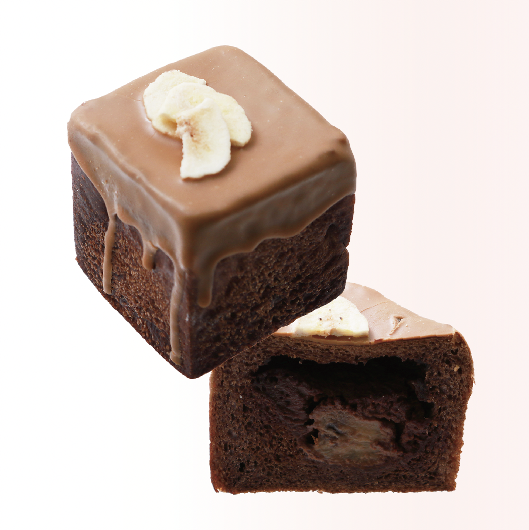 ショコラのキューブパンに、ビターなチョコクリームとバナナを包み、仕上げにコーヒーチョコをコーティングしました。