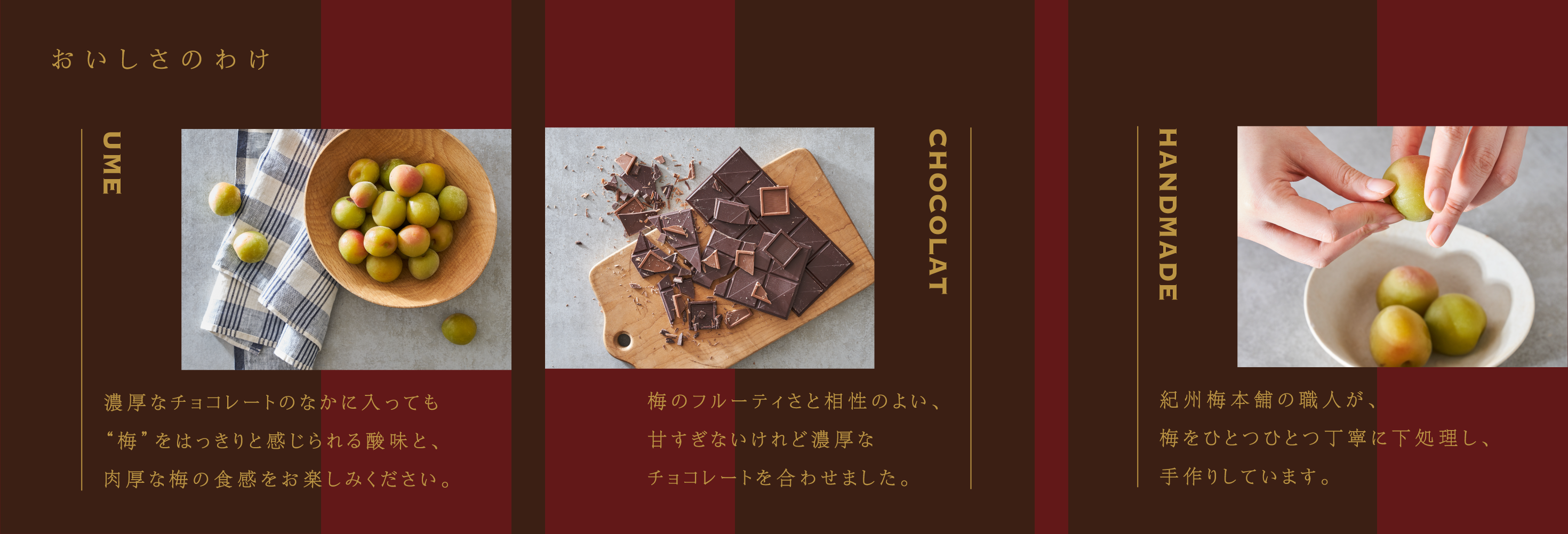 「うめノ テリーヌショコラ」は「梅の美味しさをもっと多くの人に届けたい!」という想いから、スイーツ作りが始まりました。数十を超える試作品の中で、職人がひとつひとつ丁寧に漬け込んだ芳醇な紀州南高梅をチョコレートテリーヌにふんだんに使用し「爽やかな香りとほろ苦い甘味」を愉しむことができる「うめノ テリーヌショコラ」が完成しました。しっとりとしたチョコレートテリーヌに、肉厚な梅の食感、香りと苦味のマリアージュ、最後にほのかにコーヒーの香りをまとわせることで、大人のスイーツに仕上げました。バレンタインにぴったりなこの商品を、ぜひお楽しみください。
