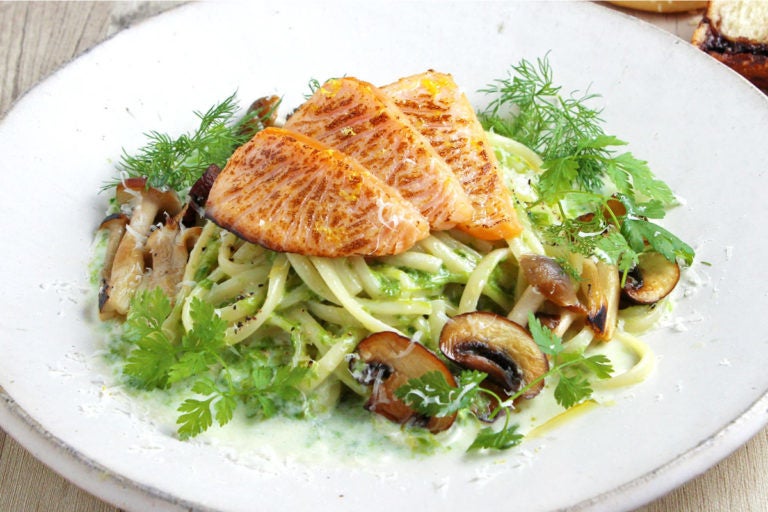 ◆自家製スモークサーモンとキノコの青海苔クリームソース