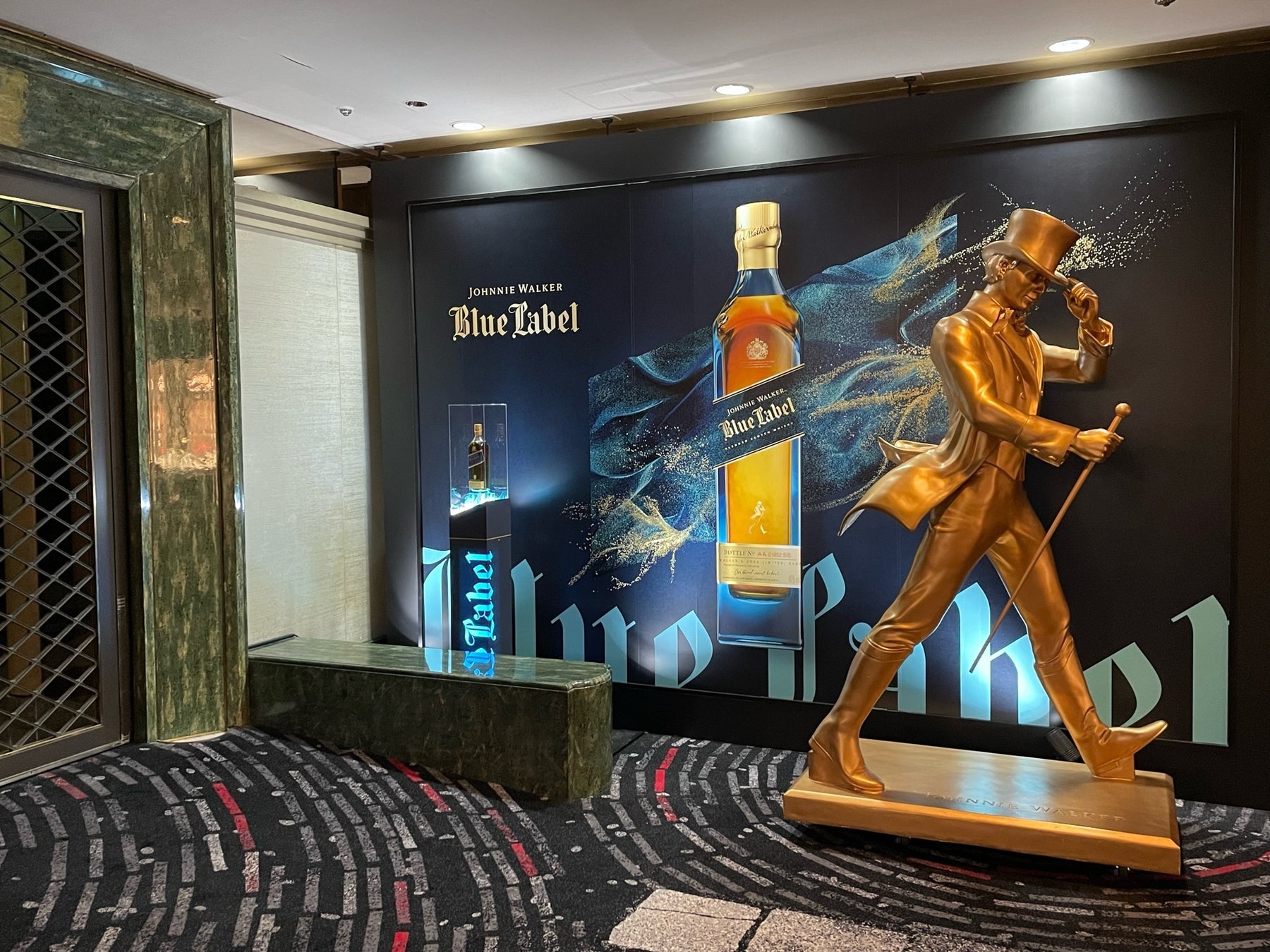 ジョニーウォーカーのブランドマークである、「ストライディングマン(闊歩する紳士)」とブルーラベルがお客様をお迎えいたします。