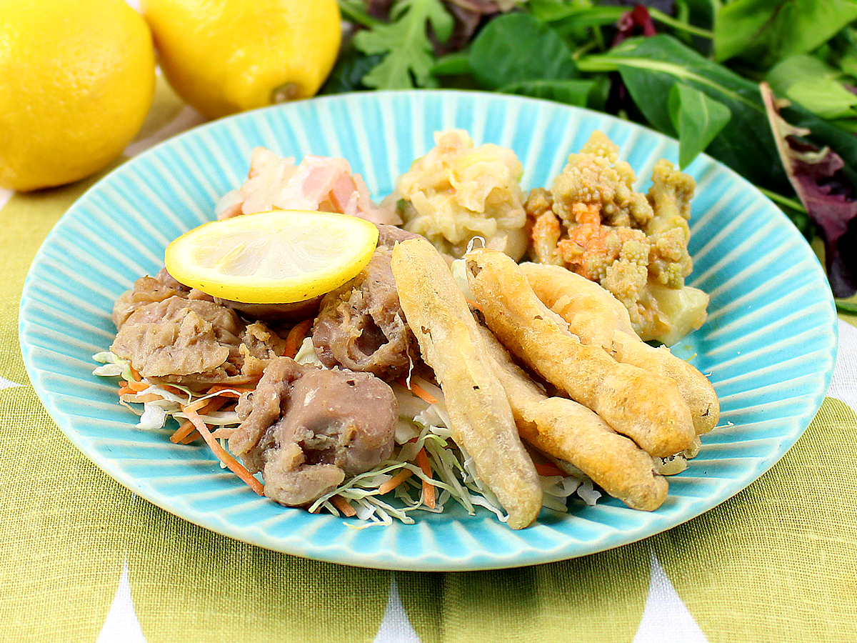 コリコリした食感でスパイシーな鶏の砂肝焼きとゴボウのから揚げを、コールスローサラダに合わせました。レモンの爽やかな酸味が砂肝の味を引き立てます。キャベツ、人参、玉ねぎのサラダが砂肝とゴボウの出汁を吸うので、野菜からも十分な旨味を感じていただけます。副菜は、大根とベーコンの黒胡椒あえ、白菜と鮭のガーリックバター、ロマネスコのカクテルソースです。