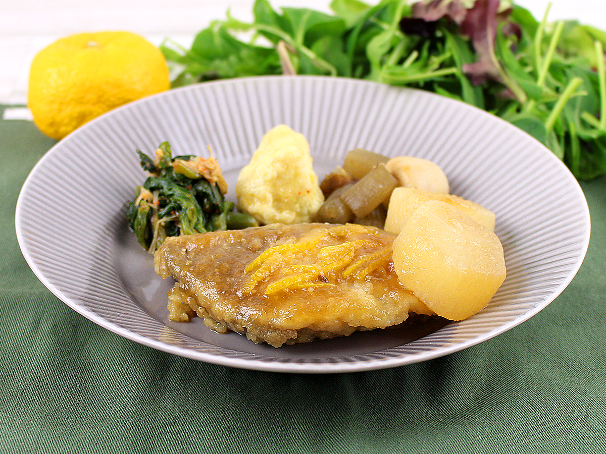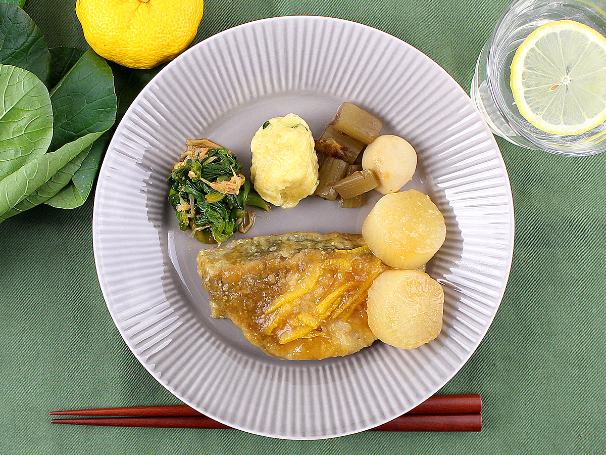 魚料理の定番ぶり大根を天然のぶりでご用意しました。煮崩れないように揚げて旨味を閉じ込めたぶりに大根を添え、ゆずを散らせてさっぱりとさせております。お出汁と甘みのある醤油をブレンドした和風だれを絡めてお召し上がりください。副菜は春を先取りした菜の花とえのきの辛味噌あえ、かぼちゃ豆腐、ふきと里芋煮です。
