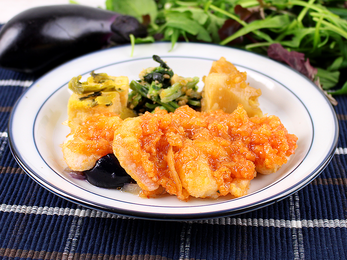 中華料理の定番海老のチリソースをご用意しました。米を原料とする中国の発酵調味料「酒醸(チューニャン)」を使用して、まろやかな甘さとコクのある味わいになっています。茄子と一緒にソースをたっぷり絡めてお召し上がりください。副菜は、絹揚げ豆腐の高菜がけ、ひき肉と青梗菜のあえ物、筍の甘酢あんです。