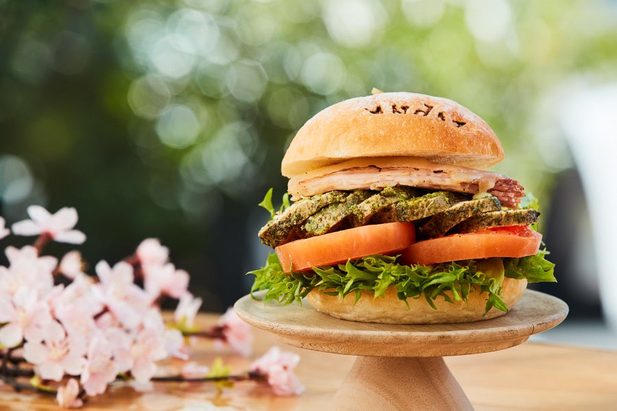 4月・5月のシーズナルバーガーには、「スプリング ハーブグリルチキンバーガー」が登場いたします。タイム、ローズマリー、ガーリックといった春の爽やかなミックスハーブをたっぷりと使用し、24時間マリネした鶏胸肉を、低温でじっくりと蒸し焼きに。最後にグリルをすることで、中はしっとりと柔らかくジューシーに、皮はパリッと焼き上がり、旨味と食感どちらも贅沢にお楽しみいただけます。また、シャンパンハムやエメンタールチーズがコクと食べ応えをプラスし、たっぷりと満足感のある逸品です。