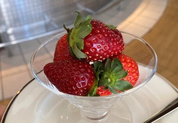 また、ランチビュッフェ・ヒルトンブランチでは「相葉苺園」より入荷した黒いちご「真紅の美鈴」とおすすめ品種をグラスサービスで提供します。「真紅の美鈴」は糖度が高くアントシアニンが多く含まれ、中まで深い赤色が特徴。完熟してから摘むため日持ちせず、市場にはほとんど出回らない希少な苺です。
