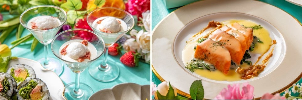 丁寧に下ごしらえすることで、新玉葱の甘さを最大限に引き出し、塩漬け桜の塩味と玉葱の甘味がバランスよく調和した「新玉葱のブランマンジェ 桜香る春仕立て」、柔らかく焼き上げたサーモンに香り豊かな柑橘バターと春の香りを感じる蕗味噌を添えた「サーモンのオーブン焼き 柑橘バターと蕗味噌添え」は柑橘の香りとふきのとうのほろ苦い香り、味噌がうまく組み合わさった料理です。