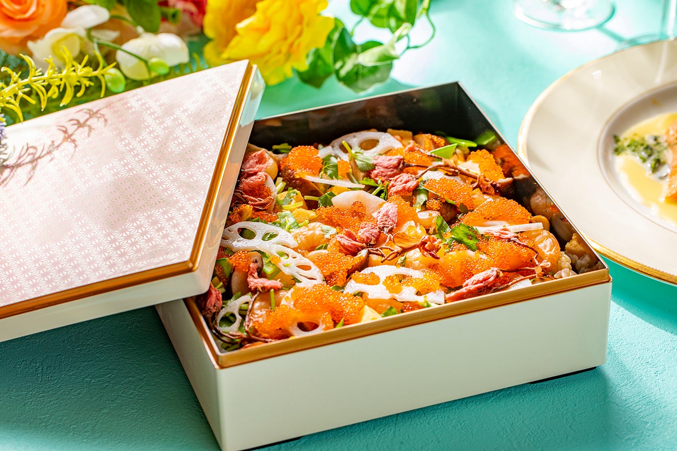 テラス レストラン特製「春菜寿司」はれんこん、椎茸、三つ葉、絹さや、海老、とびっこ、玉子焼き、桜の花びらなど約8種類の具材を贅沢に使用した「春」が詰まった一品。宝石箱のような彩りとシェフが一つ一つ異なる味つけで手間をかけて仕上げた具材のハーモニーをお楽しみいただけます。まさに口の中に春が広がる期間限定のメニューです。(ディナーのみ提供)