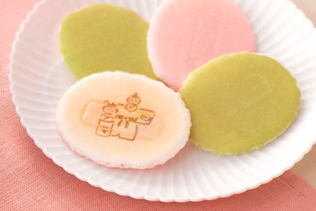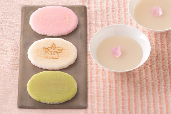 桃色は桃の風味の蜜(みつ)、緑色はあっさりと和三盆の風味の蜜をひいており、ほのかな甘味が美味しいおせんべいとなっています。