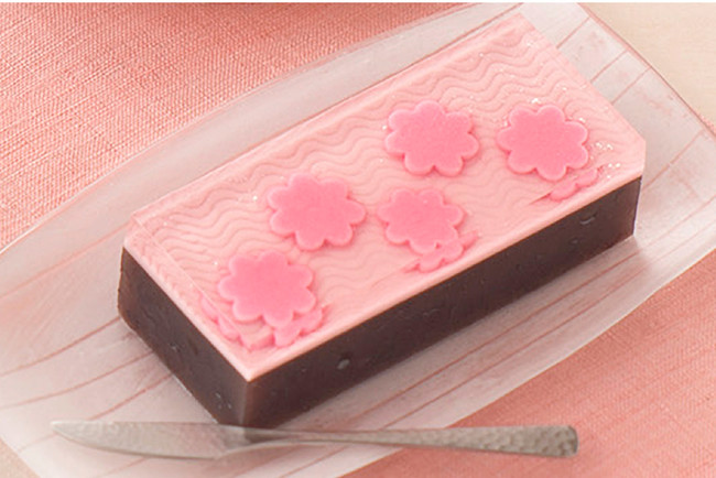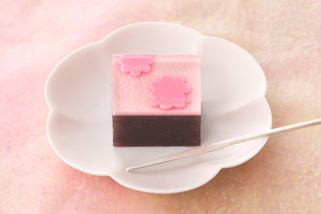 ♪お花をあげましょ 桃の花…透きとおる琥珀羹に桃の花形をあしらい、小豆の風味豊かな小倉羊羹とかさねた二層の羊羹でございます。