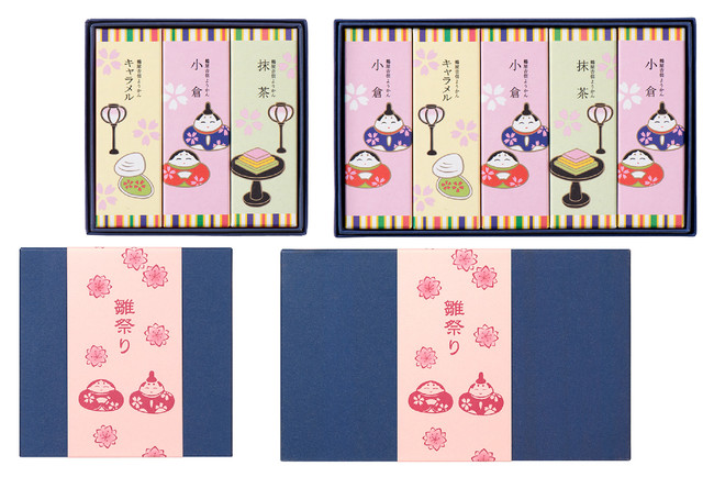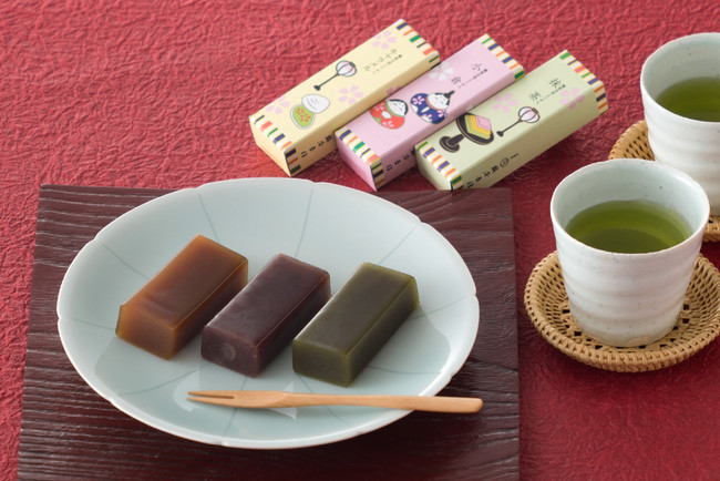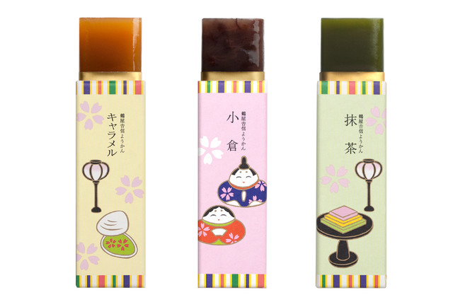 通年販売中の、5種の風味のミニサイズ羊羹「鶴屋吉信ようかん」から、「小倉」「抹茶」「キャラメル」の3種の風味を、雛まつり期間限定の可愛らしいパッケージで包みました。