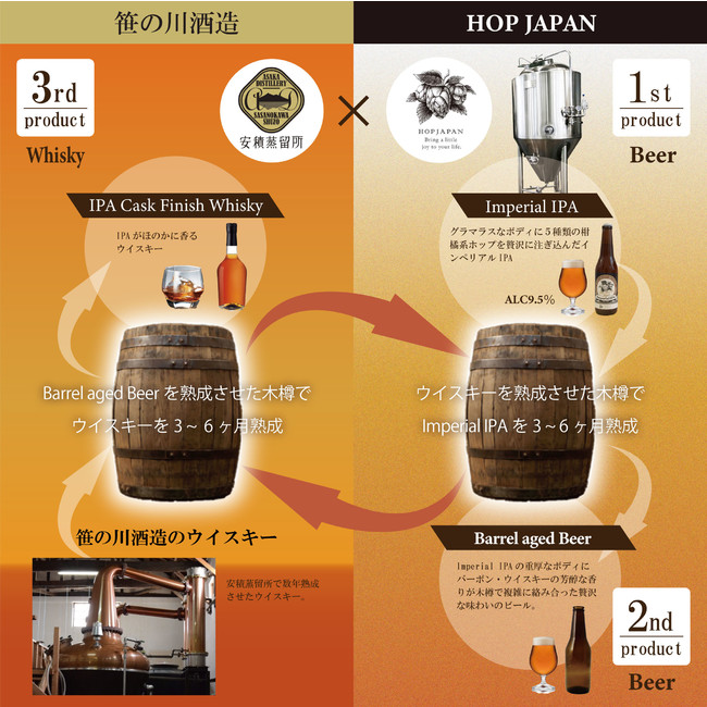 笹の川酒造では、アメリカから輸入したバーボンの樽にウイスキーを入れバーボンの芳醇な香りがあるウイスキーを発売。その後、空になった樽をホップジャパンに移送し、アルコール度数9.5%と高めの「インペリアルIPA」というビールを入れて3か月~半年熟成、バーボン・ウイスキーの風味がある「バレル(樽)エイジドビール」と言われるスタイルのビールを販売する。