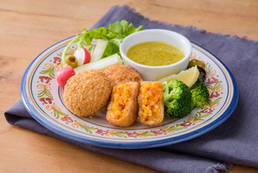 イカスミと魚介のうまみにチーズのコクが合わさった、リゾット 仕立てのライスコロッケ。口当たりの良いサックリした衣の中に、 程よい米の食感とイカスミならではのうまみとコクが楽しめます。 |