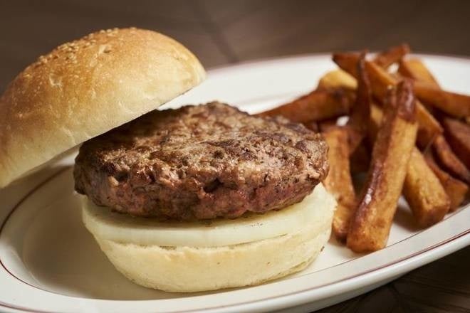 ステーキに使用する牛肉はUSDA Prime Beefから独自の選定方法によってセレクトしています。それをチルドで空輸し門外不出のエイジングノウハウで熟成させ、高温ブロイラーで焼き上げて提供してます。ハンバーガーのパティには、このステーキに使用される熟成肉50%とチャックアイロール50%を使用。これらをつなぎを使わず成形し、香ばしく焼き上げます。付け合わせにフレンチフライドポテトをご用意。牛脂から抽出した油で2度揚げしているため、風味豊かに仕上げています。