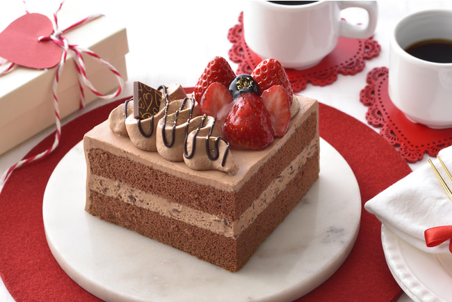 まろやかな甘みのチョコチップ入りチョコクリームをココアスポンジでサンドし、チョコクリームで仕上げたチョコづくしのバレンタイン限定ケーキです。上面には苺とブルーベリーをトッピング。チョコケーキ好きなふたりでシェアして♡