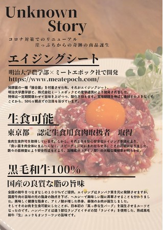発酵菌の一種「接合菌」を付着させた布、それがエイジングシート。明治大学農学部と、株式会社ミートエポックとの産学連携により開発された。特徴は食材を一定期間寝かせることによって旨味を上げつつ酸化を抑え、肉に使えば熟成肉になります。賞味期限を伸ばし食材のロスをなくすことから、SDGs観点での注目も浴びている。
