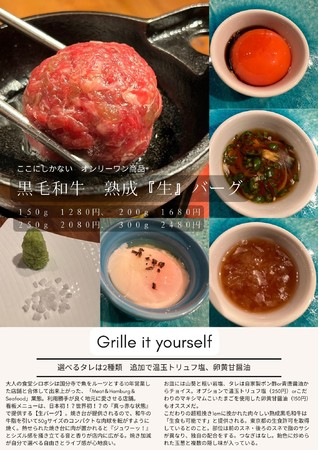 高級な肉を普通に生食しても旨味は不十分と考え、長ければ1ヵ月以上熟成させてアミノ酸を増加させた黒毛和牛を東京都の認可を得ることにより、生の真っ赤な状態でハンバーグを提供することを可能にした。焼き台も一緒に提供し、50gサイズの球体を転がすように焼く。客自身で好きな焼き加減で食べることが出来ることと、目の前で焼くシズル感が美味しさを引き立てる。