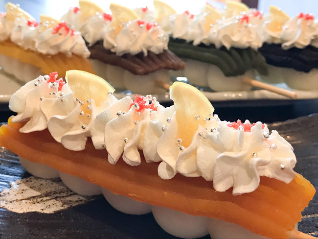 お団子は国産100%の米粉を使用し、全5種の餡(宇治抹茶、スイートポテト、紅芋、パンプキン、モンブラン)は甘味度を抑えました。その上から、和洋折衷をイメージして、ホイップをふんだんに乗せ、仕上げにストロベリークランチと、ハチミツ生レモンか苺をトッピングして完成。10代、20代の若い方はもちろん、インバウンドのお客様にもクレープ感覚で食べて頂きたいワンハンドスイーツになっています。