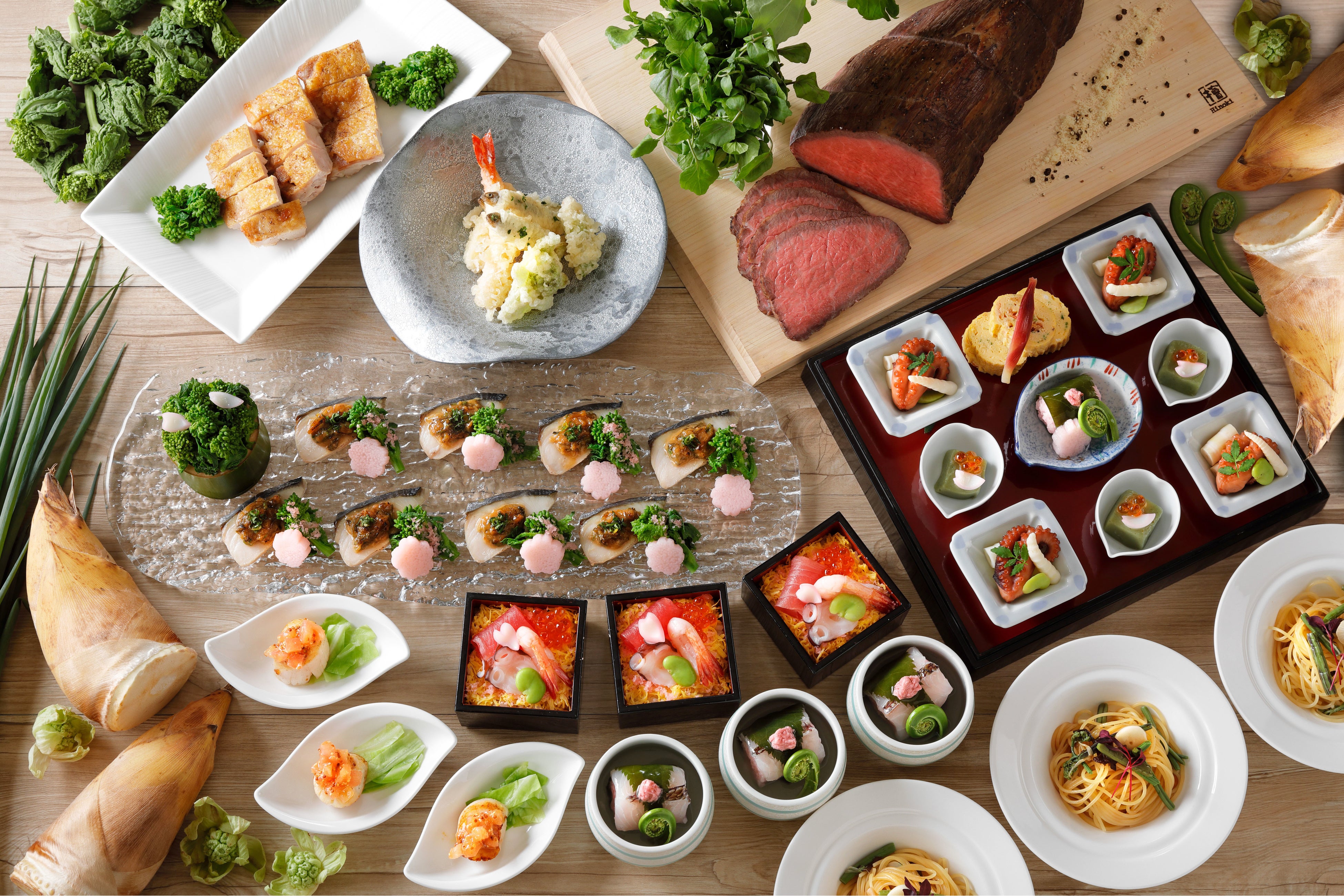 蛸の柔らか煮と姫竹当座煮/帆立と九条ネギのソテー/よもぎ胡麻豆腐 いくら添え/鰆の九条ねぎ味噌焼き/京豆腐と筍の揚げ出し/小かぶらと京揚げの鶏そぼろ餡/山菜パスタ/ポークグリル/美笑牛のローストビーフ/都ホテルカレー/八代目儀兵衛ホテルオリジナルブレンド米/点心/真鯛と筍の白蒸し薄葛仕立て 六味の香り/雛ちらし寿司/天ぷら(魚介1種春採れ野菜3種)/天丼/ (土日祝限定)握り寿司、オムライス