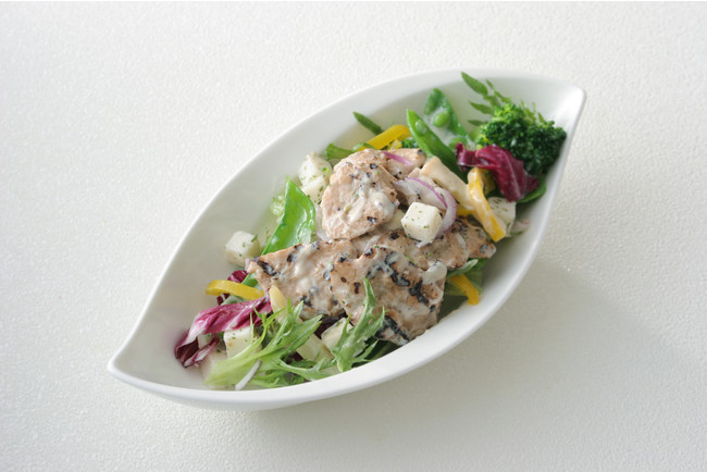 グリルした「NEXTハラミ」と食感のあるブロッコリーやスナップエンドウ、豆腐ベースのシーザーソースを合わせたコクと旨みのあるサラダです。体を気遣いたいときや日常の食事、夕食としてもおすすめです。