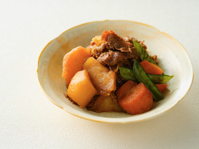 大豆ミートを肉じゃが風にアレンジしました。肉の食感が出るように<まつおか>のしっかりとした味付けを加え、ご飯に合う一品に仕上げました。
