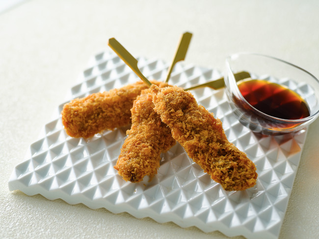 大豆ミートをお肉と同じ感覚で召し上がっておただきたいという思いで、串カツを作りました。ネクストミーツハラミを串にさし、<アヴァンセ>特製の生パン粉をつけて仕上げています。串カツソースをたっぷりつけてお召し上がりください。