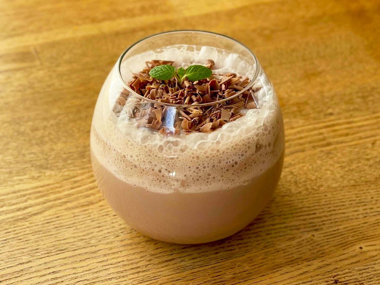 チョコレートアイス、牛乳、チョコレートソース、氷をミキサーでシェイクし、粗く削ったミルクチョコレートをのせました。ビターな味わいになっています。