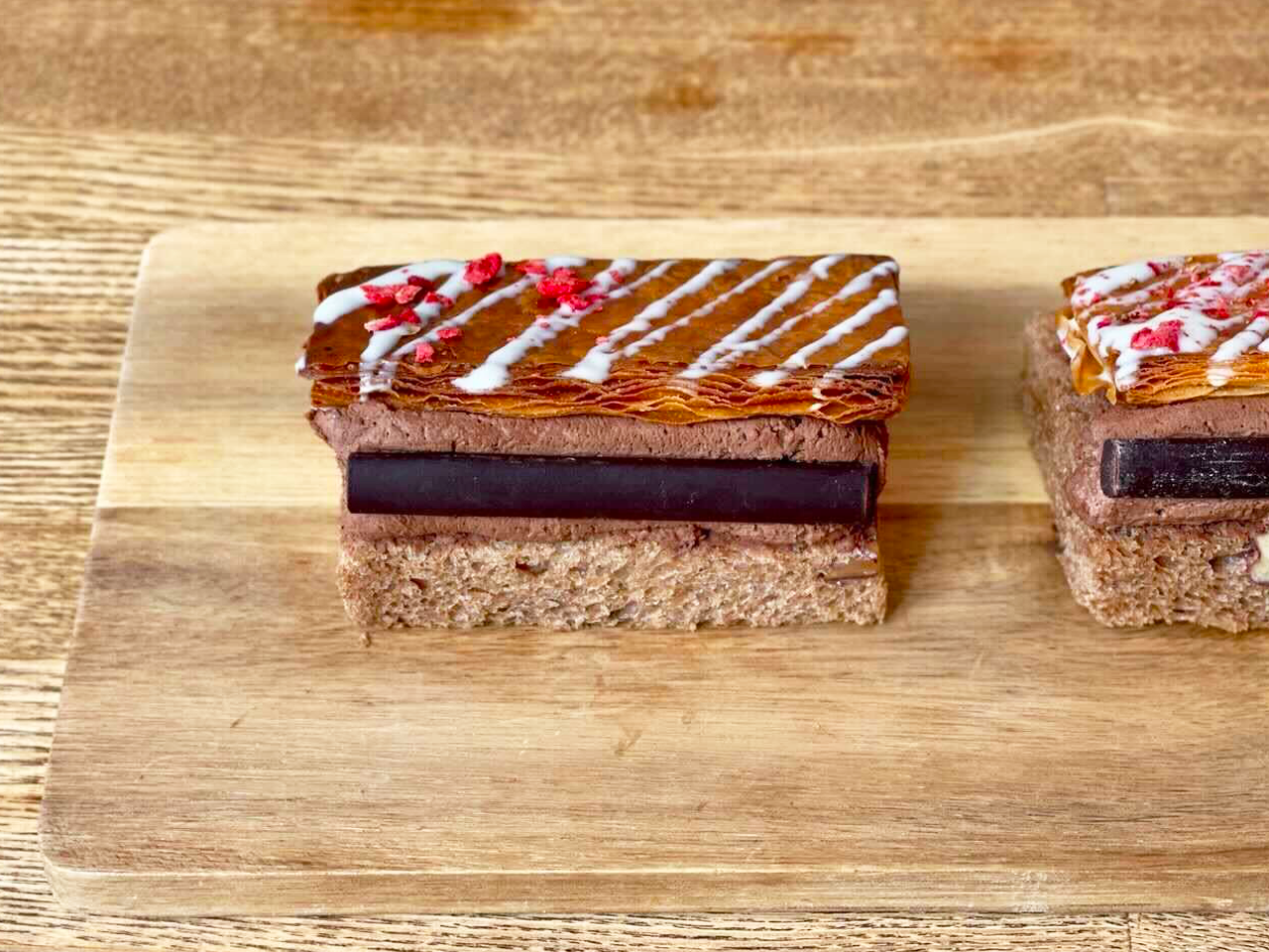 栄養価の高い有機キャロブ粉を使用した土台パンに、チョコレートホイップとヴァローナ社のチョコレートをパイでサンドしました。ちょっぴりビターで大人な味わいのバレンタイン期間限定不イッチです。