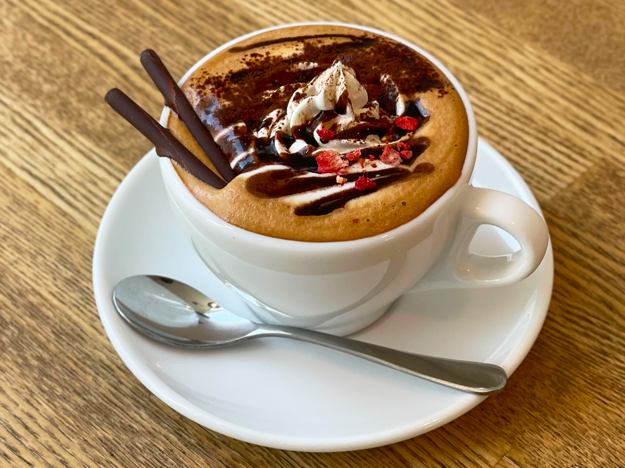 ストロベリーシロップ、エスプレッソ、チョコソースに口当たり滑らかなミルクを合わせ、ホイップクリーム、チョコレート、ドライベリーをのせました。ストロベリーがほのかに香る甘いモカ!