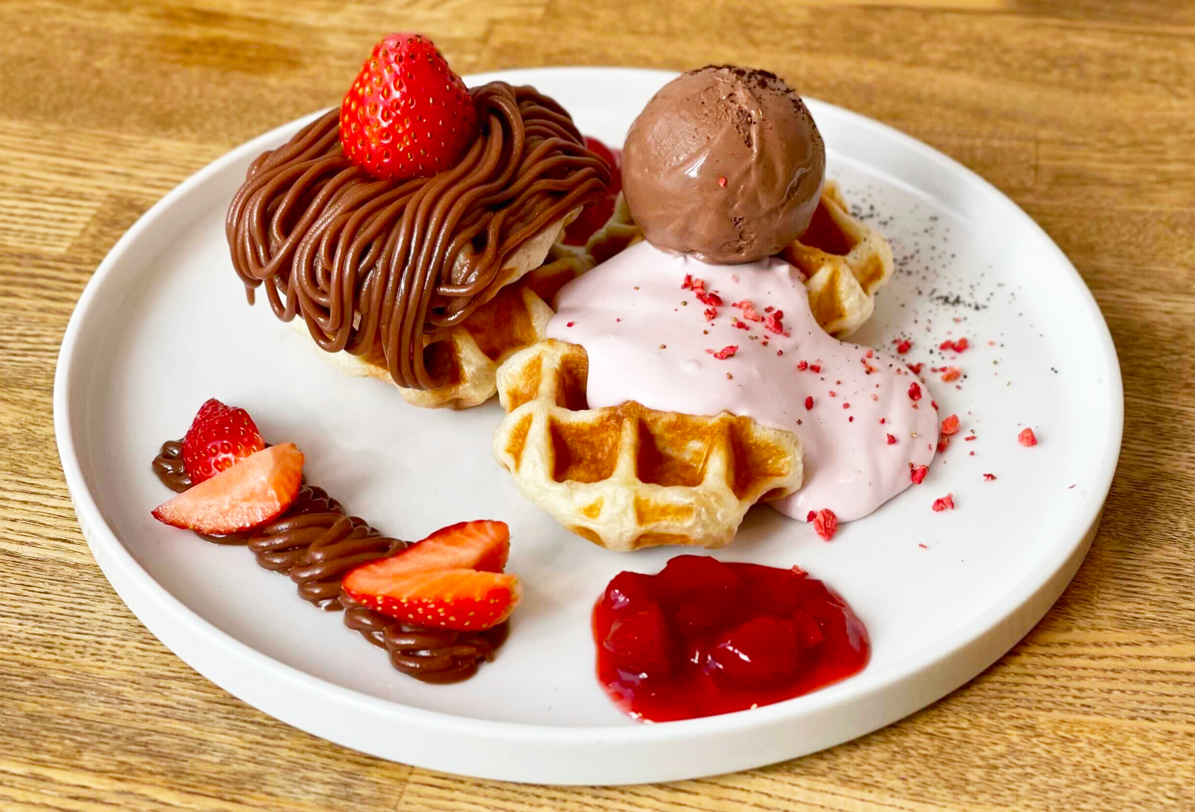大人気食パン「ムー」をワッフル型で焼いた「ムッフル」の期間限定メニュー。ビターなチョコレートを使用した生チョコクリーム、チョコレートアイス、フレッシュの国産苺、自家製ベリーエスプーマ、ドライベリー、苺の果肉ソースをトッピングしました。