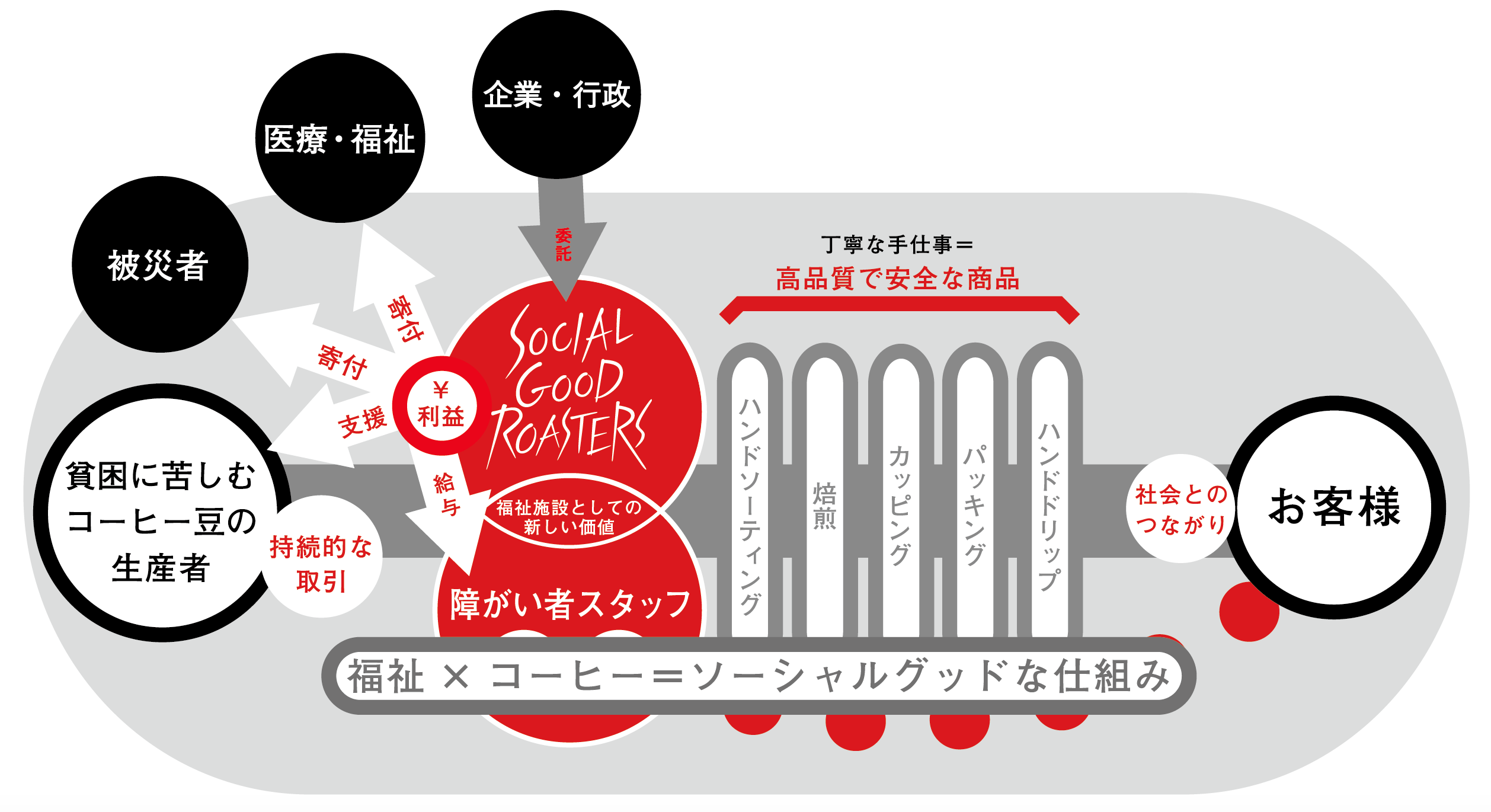 ソーシャルグッドロースターズは障がい者雇用における就労継続支援B 型の福祉施設であり、 障害のあるバリスタや焙煎士が活躍する、ロースタリーカフェです。コーヒーの仕事を通して、 自立と自己実現を支援しています。 一杯のコーヒーが障がい者福祉と社会との接点にとなり、お客様の喜びに。 そこから生まれた利益は生産者や社会の支援に。そんな良いことの循環を生み出します。
