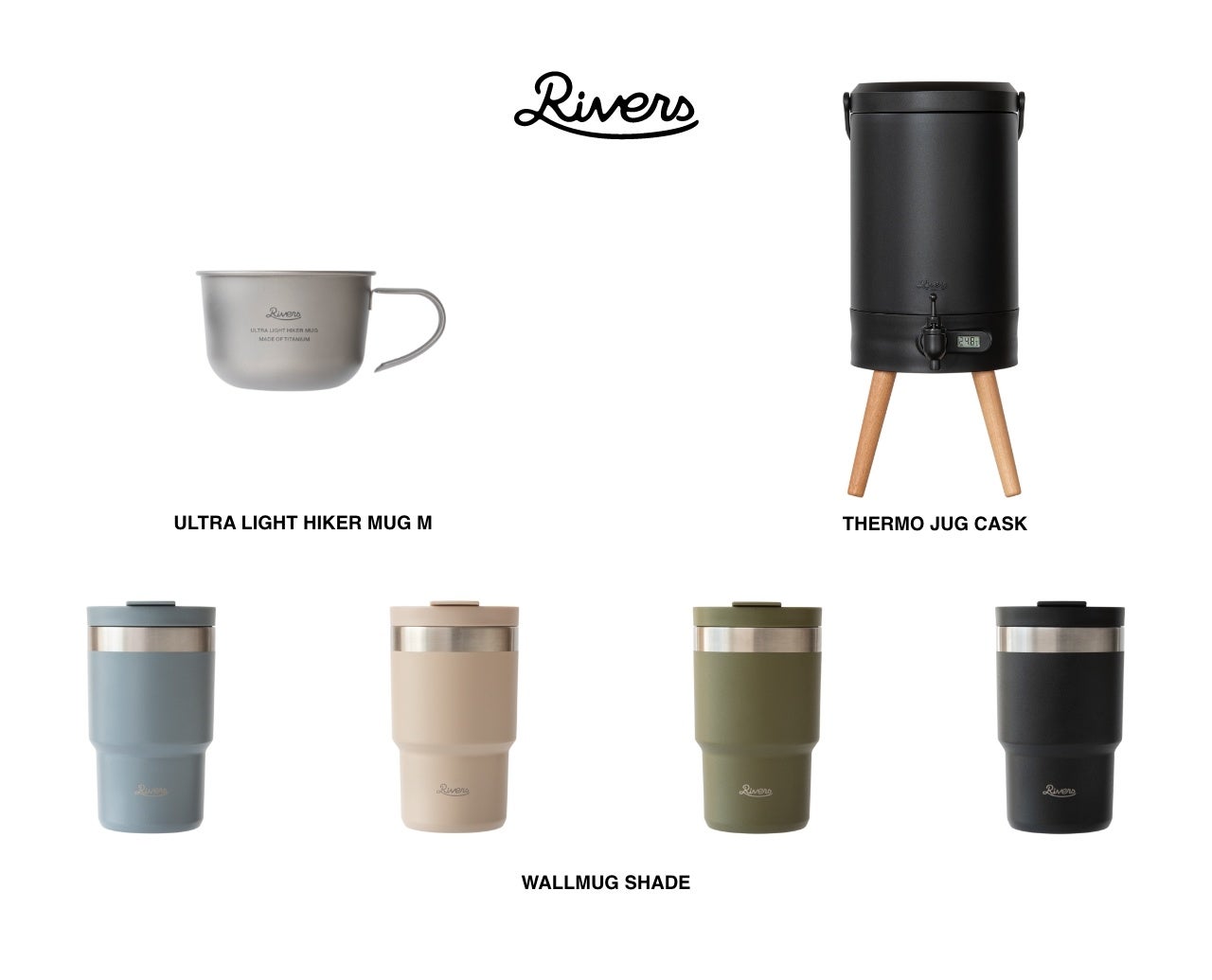 RIVERSより新たに登場するのは、ハイカー向けの超軽量チタンマグ「ULTRA LIGHT HIKERMUG M」・真空ステンレスタンブラー「WALLMUG SHADE」・5Lのサーモ大容量ジャグ「THERMO JUG CASK(2月中旬発売)」の3商品です。
