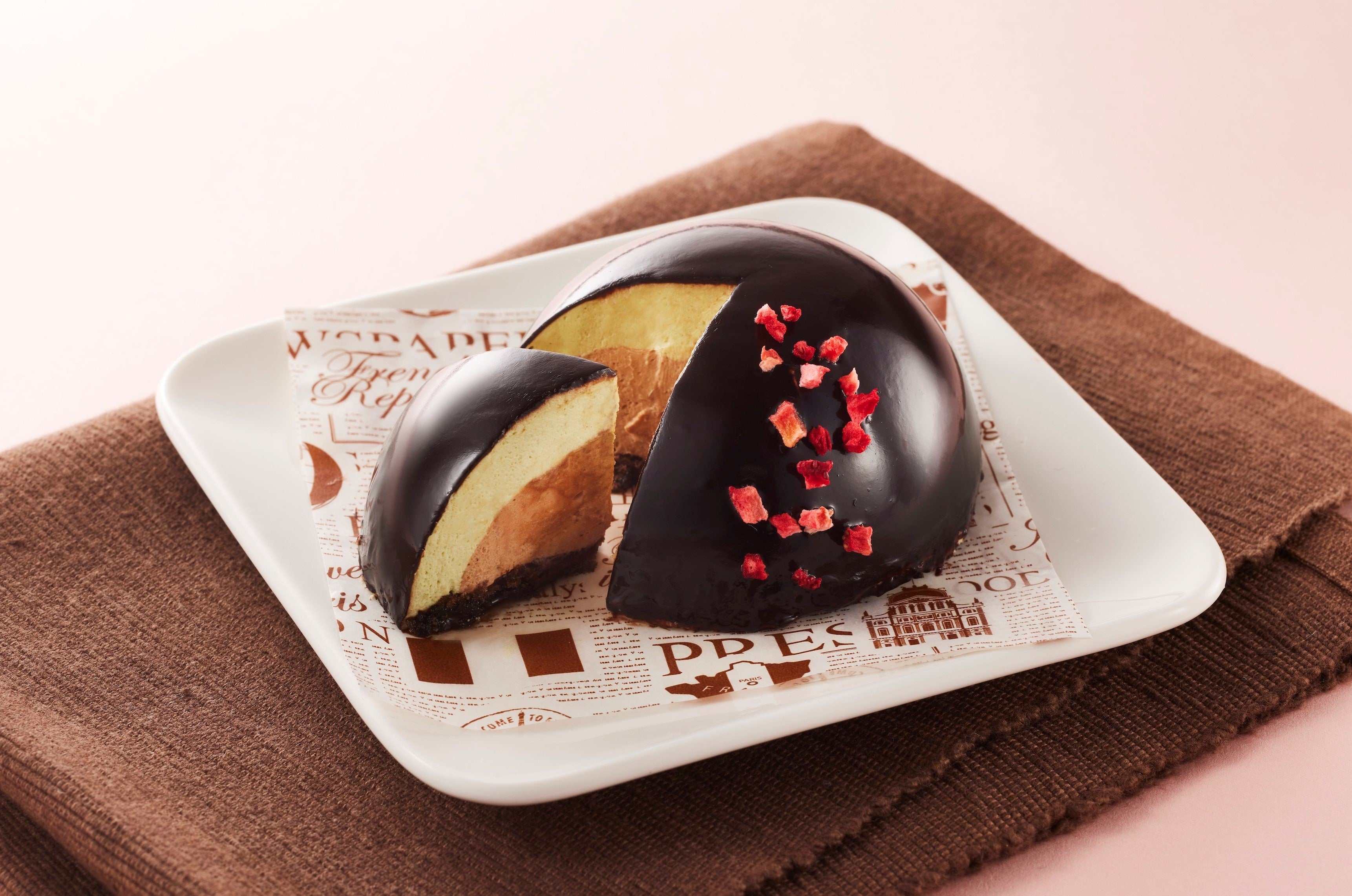 イタリア産ピスタチオのクリームとベルギー産チョコレートの濃厚さを楽しめるドームケーキです。ドライストロベリーのトッピングや、フォークを入れたときの3層の見た目もお楽しみいただける一品です。