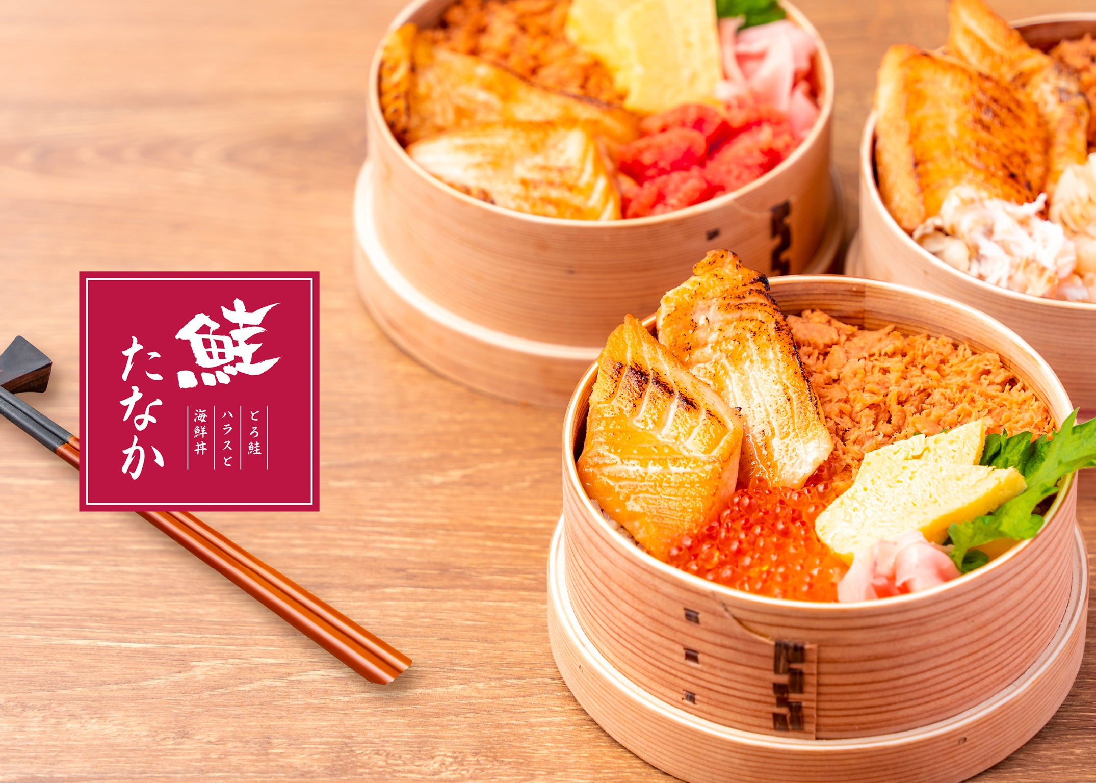 海鮮酒場が始めた本気のデリは女性に人気の高い鮭とサーモンを盛り込んだヘルシー海鮮丼が一番人気。脂がのった鮭ハラスに鮭フレークや生サーモンのほか、いくらやホタテなどお好みの具材をトッピングすることが出来ます。