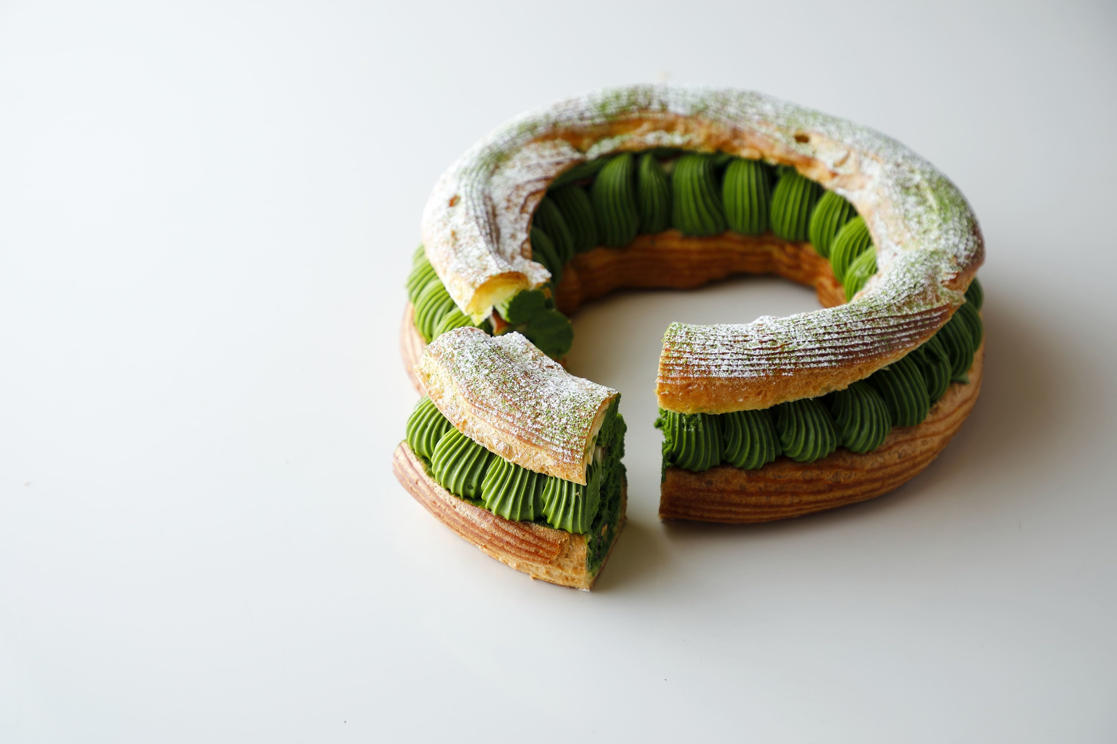 フランスの伝統菓子であるパリブレストからインスパイアされた、『Paris-Ninenzaka(パリ二年坂)』は、サクッと焼き上げられたシュー生地、宇治抹茶のクリームとチョコレートのクランチ、アーモンドの女王とも呼ばれるマルコナ種のアーモンドのプラリネ、さらには西京味噌の塩味をアクセントにプラスした、一味違った「KYOTO BISTRO」ならではのスイーツです。店内でお召し上がりいただくことも可能です。京都にいらした思い出にぜひご賞味ください。