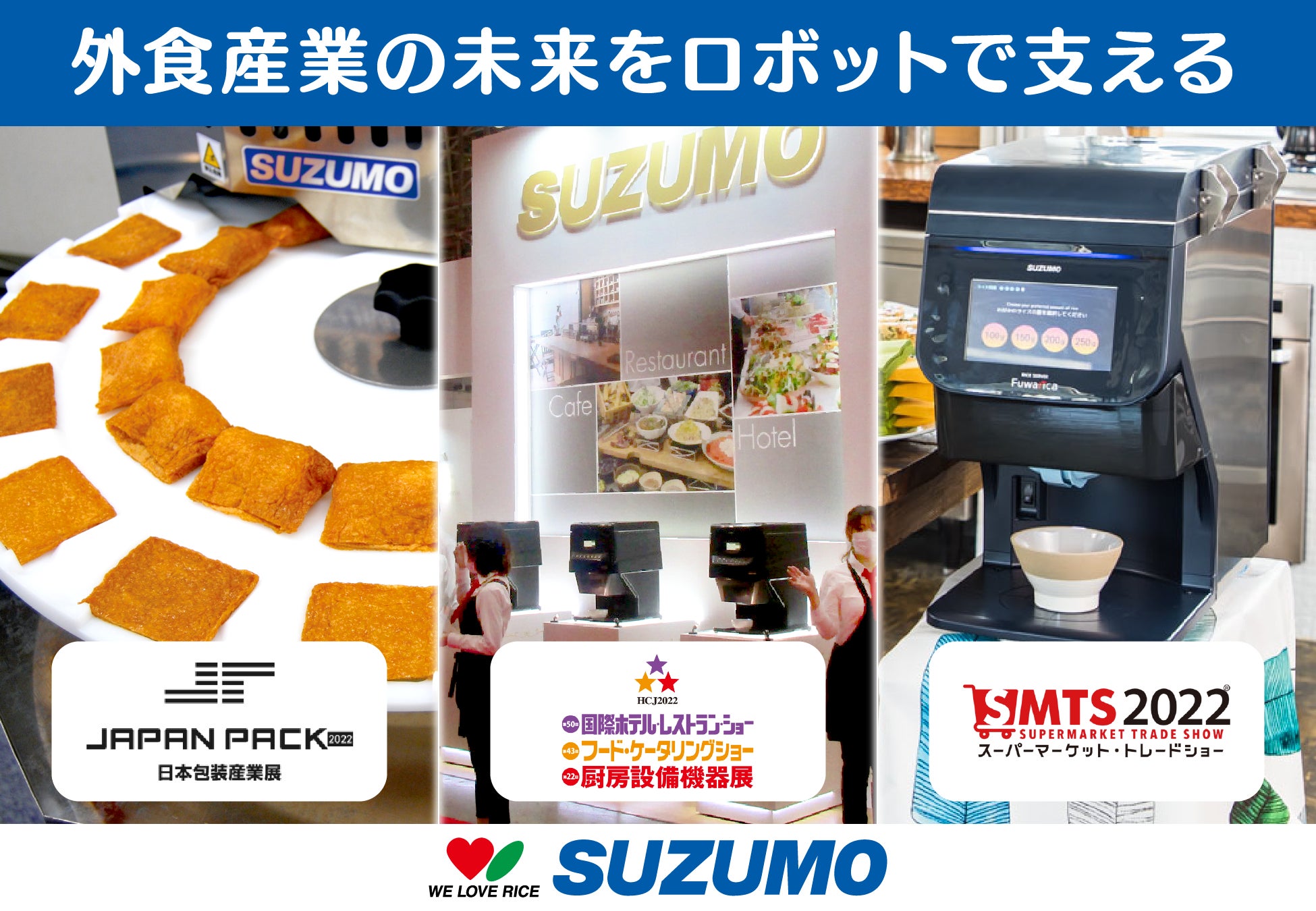 鈴茂器工株式会社(本社:東京都練馬区、代表取締役社長:鈴木美奈子、以下 鈴茂器工)は、2022年2月開催の国際ホテル・レストラン・ショー2022【2月15日(火)~18日(金)開催:東京ビックサイト】、JAPAN PACK 日本包装産業展 2022【2月15日(火)~18日(金)開催:東京ビックサイト】、スーパーマーケット・トレードショー2022【2月16日(水)~18日(金)開催:幕張メッセ】の3つの産業展示会に出展いたします。