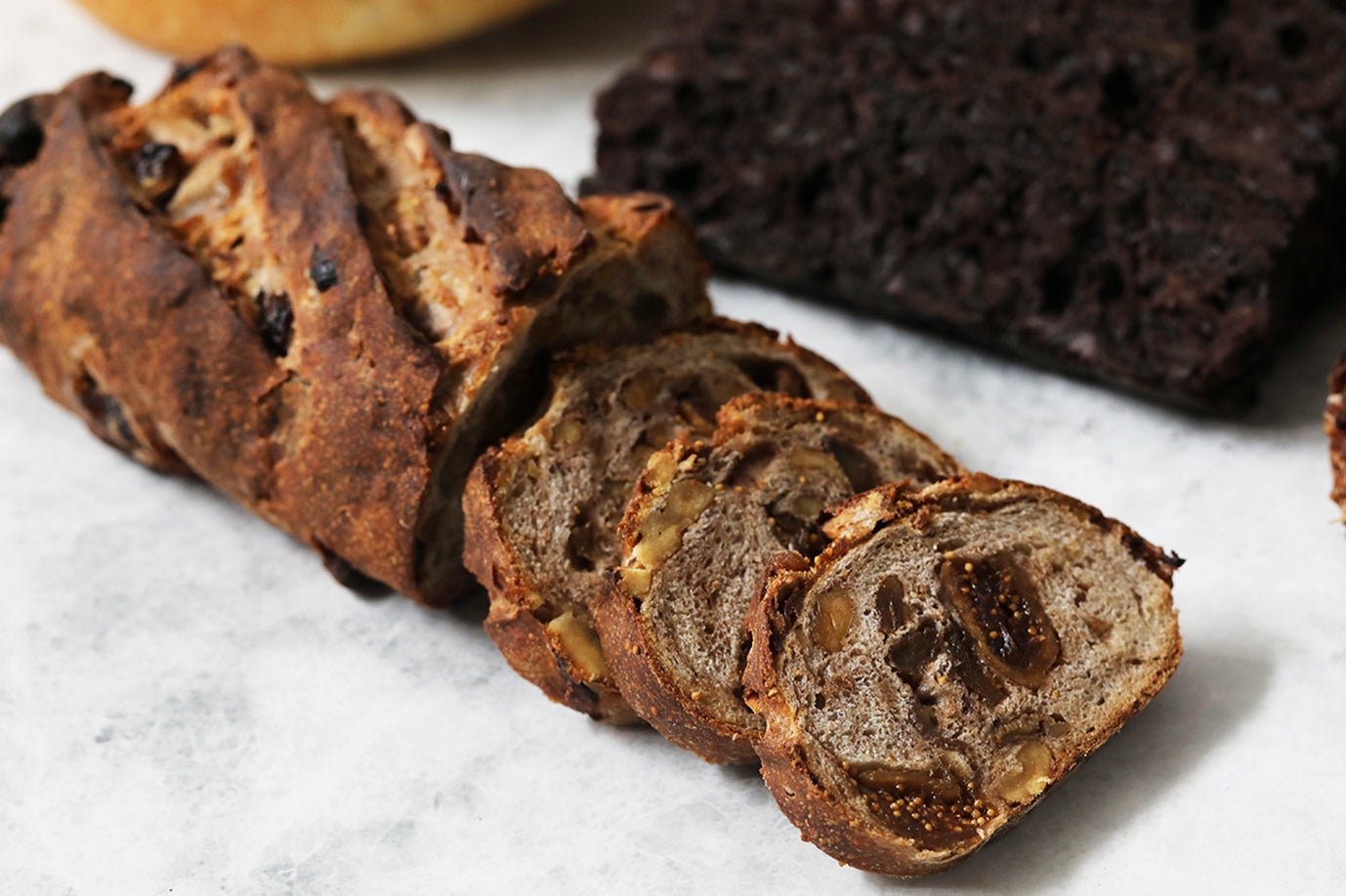フランス産のゲランドの塩や、イタリア産の中硬水を使用した生地に、赤ワインに浸けたオーガニックの白イチジク、レーズン、クルミを合わせて焼き上げました。
