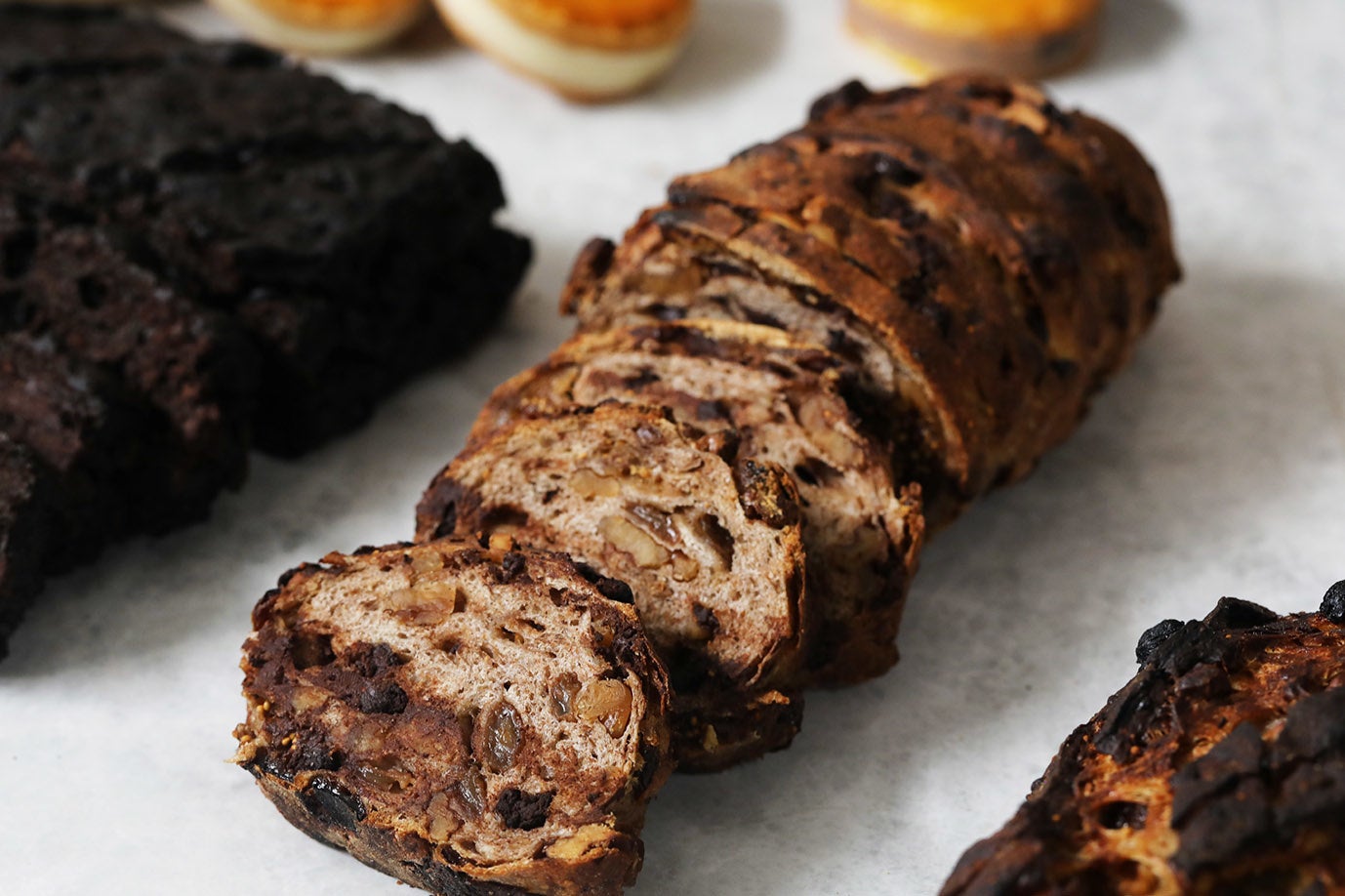 フランス産のゲランドの塩やイタリア産の中硬水を使用した生地に、カカオ70パーセントのチョコレートと赤ワインに浸けたオーガニックの白イチジク、レーズン、クルミを合わせて焼き上げました。甘さ控えめなハイカカオチョコレートと、赤ワインに漬けたほんのりと甘酸っぱいドライフルーツの相性を存分にお楽しみいただけます。