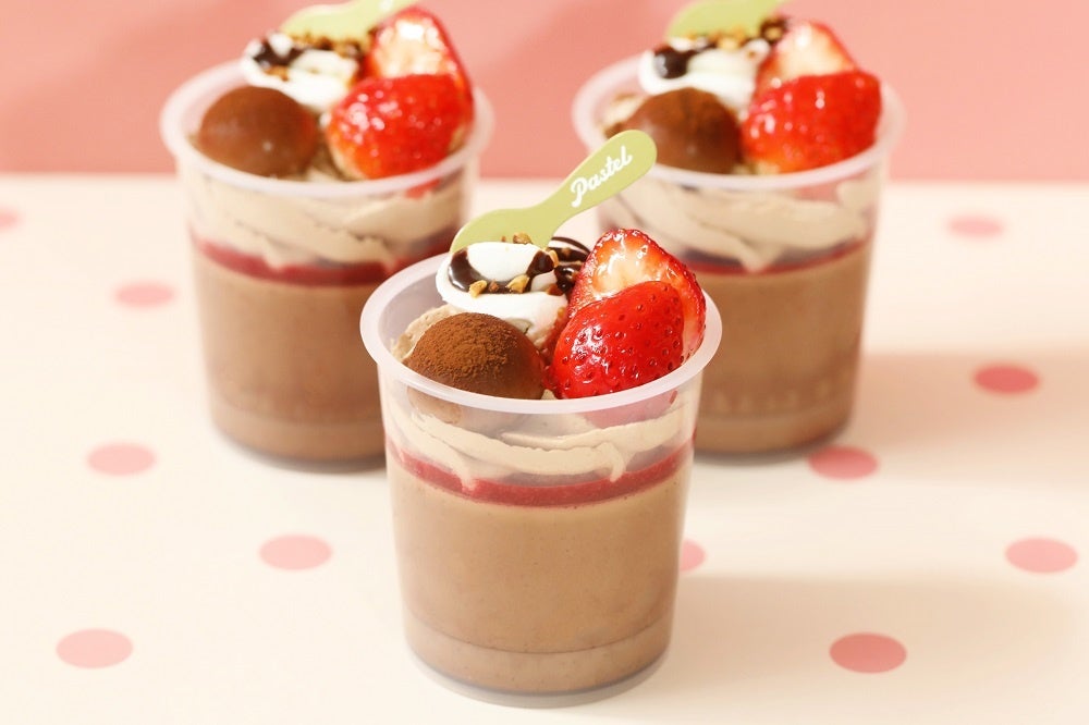 また、パステル初の試みとして、チョコプリンとチョコレート味の杏仁豆腐をかけ合わせました。なめらかな食感のチョコプリンともちもち食感の杏仁豆腐。華やかなビジュアルとチョコづくしな味わいは、バレンタインシーズンのデザートにおすすめです。
