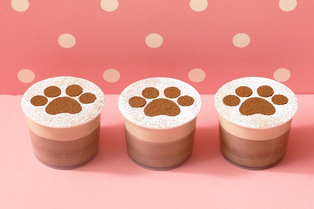 ココアパウダーで描かれたねこの肉球のイラストがキャッチーな「ニャめらかチョコプリン」。