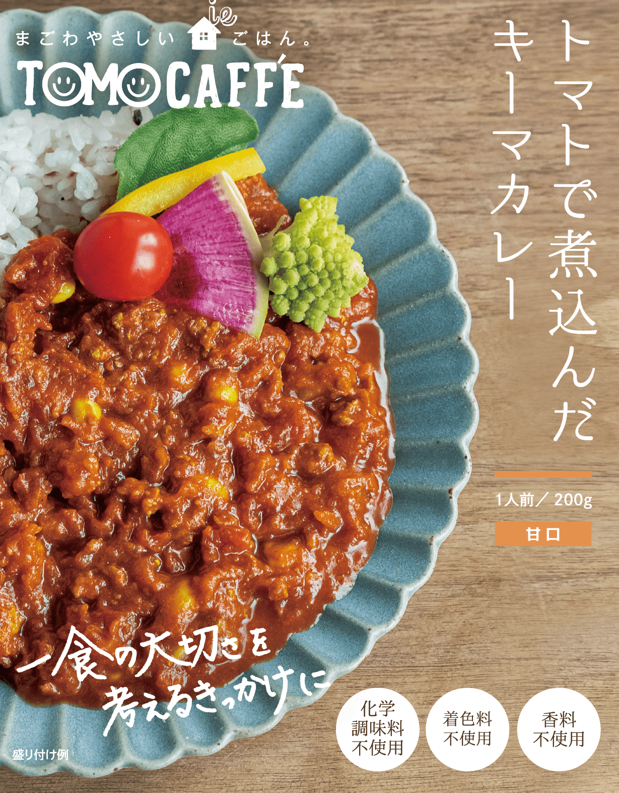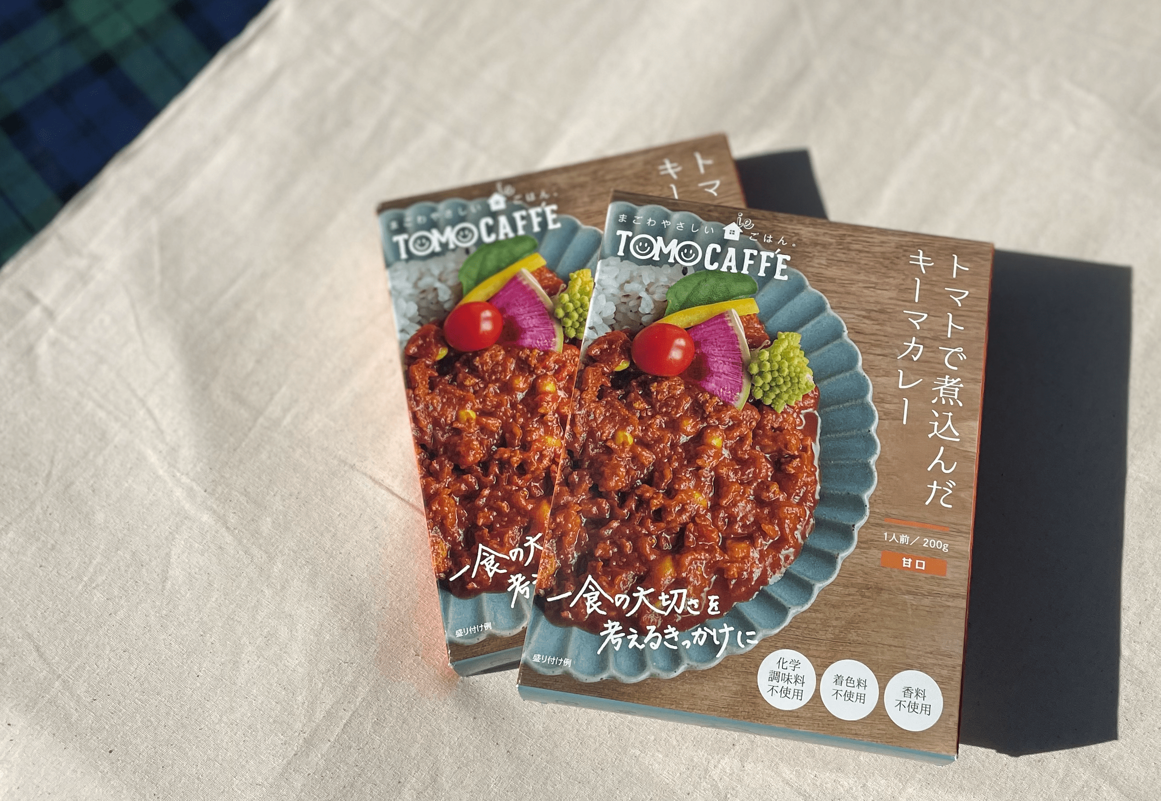 レトルトキーマカレーは私の一つの夢でした。TOMO CAFF’E のオープンから「トマトで煮込んだキーマカレー」は、美味しいと多くの声をいただき、いつかレトルトキーマカレーにできたらと思っていました。手土産や差し入れなど、日常の贈り物としてもご利用いただけるようなパッケージにしましたので、ぜひ大切なひとにおすそ分けしていただき、“一食の大切さ”を広める仲間になっていただけますと幸いです。