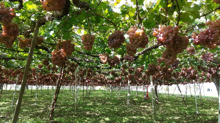 “竜眼”は奈良時代に中国から日本へと渡り、長野に根付きました。特に長野の善光寺平で栽培されていたため、”善光寺ぶどう”とも呼ばれ親しまれていました。白ぶどうなのに皮がほんのりピンク色、皮が薄く果肉が多いので、搾るとフレッシュでみずみずしいジュースができます。サンクゼールでは、生産量が減っているこの貴重なぶどうを守り、多くの方にこのワインを届けられるように、生産者の方々にご協力いただき、収穫量を増やす取り組みをしています。