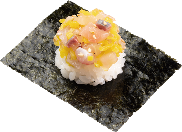 「まぐたく」からインスピレーションを受けた一品。かんぱちの脂とたくあんの相性抜群です。