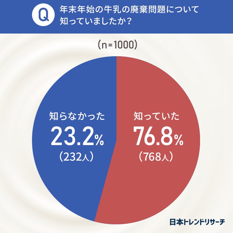 牛乳の大量廃棄問題について、76.8%の方が「知っていた」と回答しました。