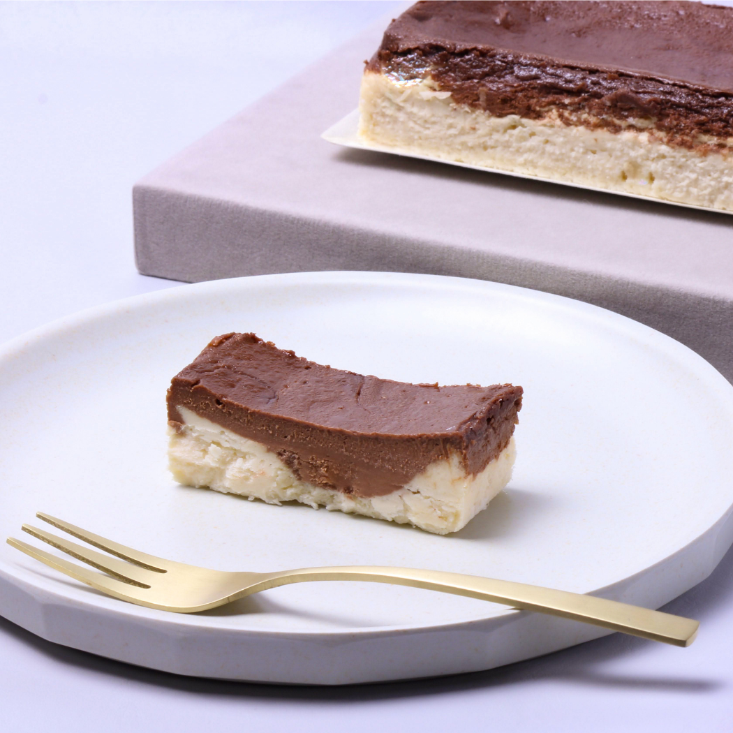 クリームチーズとサワークリームが織りなす、さっぱり濃厚なチーズケーキとガーナ産カカオ豆を使用した上品で濃厚なチョコレートの2層のチョコレートチーズケーキです。口に入れた瞬間からカカオの芳醇な香りとチーズケーキの濃厚な味わいが口いっぱいに広がり、カカオの深いコクの余韻が残ります。