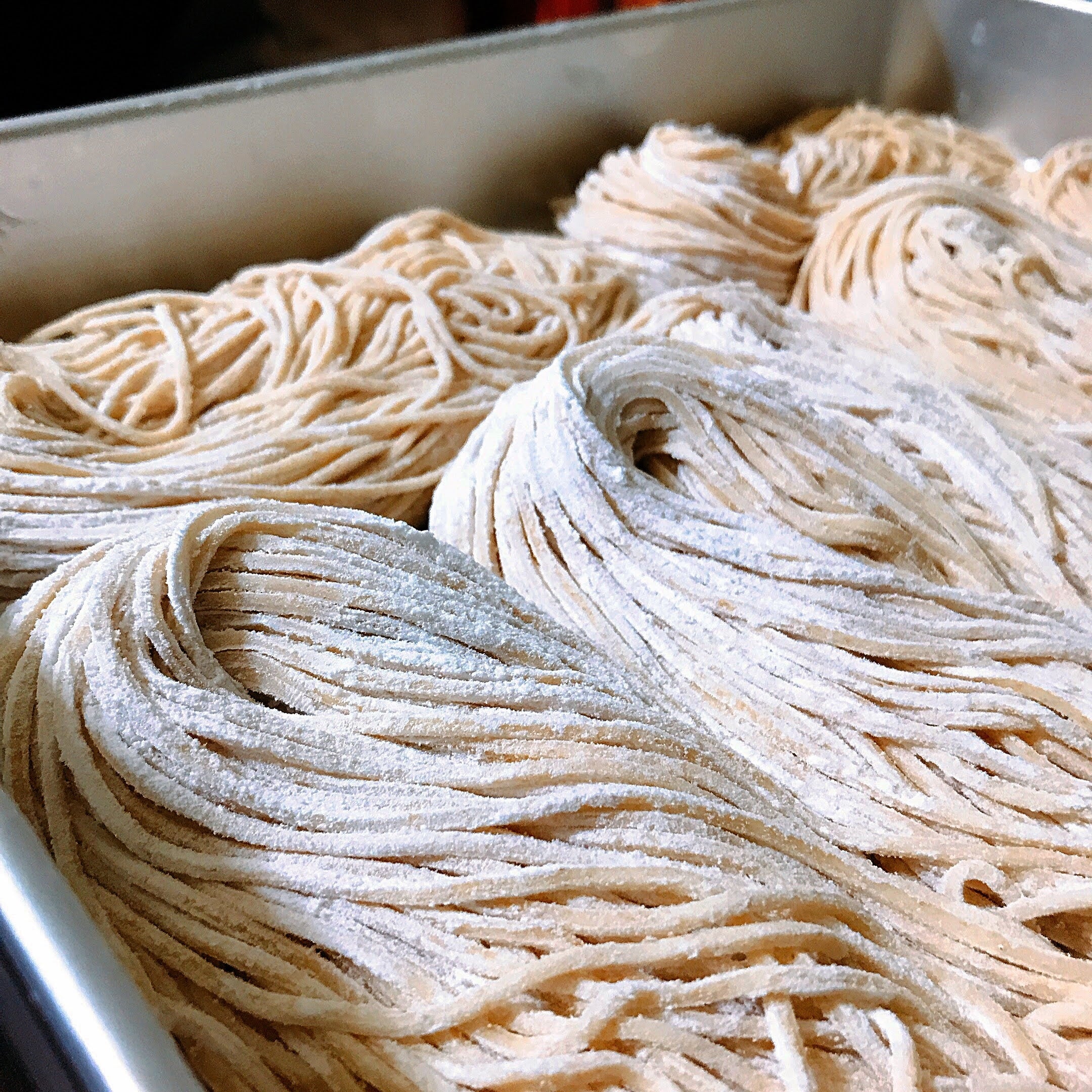 当店のひやむぎは、全て店内で作っている自家製生麺です。手打ち蕎麦や手打ちうどんのように45%以上の加水率で水を加え、鍛えと熟成を繰り返すことで乾麺のひやむぎには無い独特の艶と喉越しが生まれます。