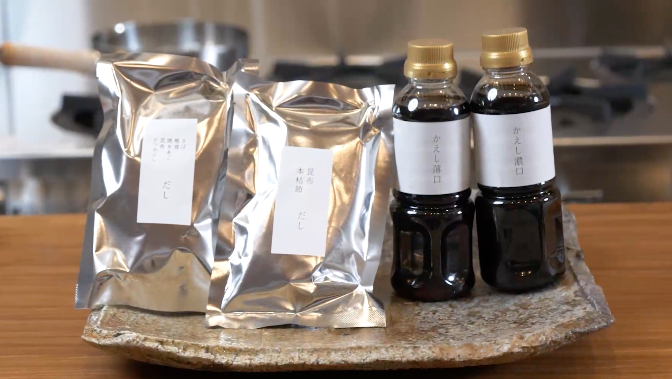 おひたしなら、だしと濃口を4:1、うどんのつゆならだしと薄口を10:1ー、と、おが和店主監修のレシピカードを見ながら合わせるだけ。実際に店主が商品を使って料理する動画も公開されており、おうちのキッチンにいながらプロの手ほどきで味付けするような気分に。