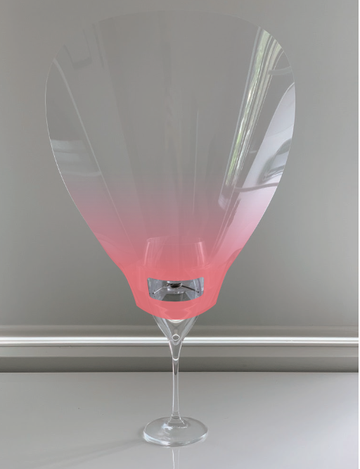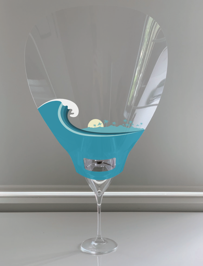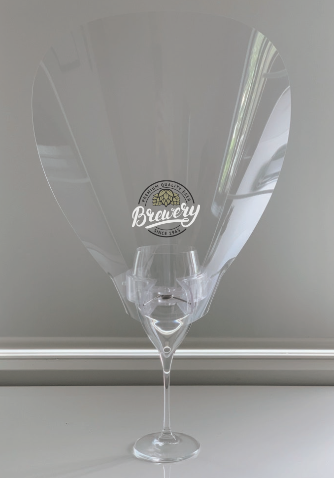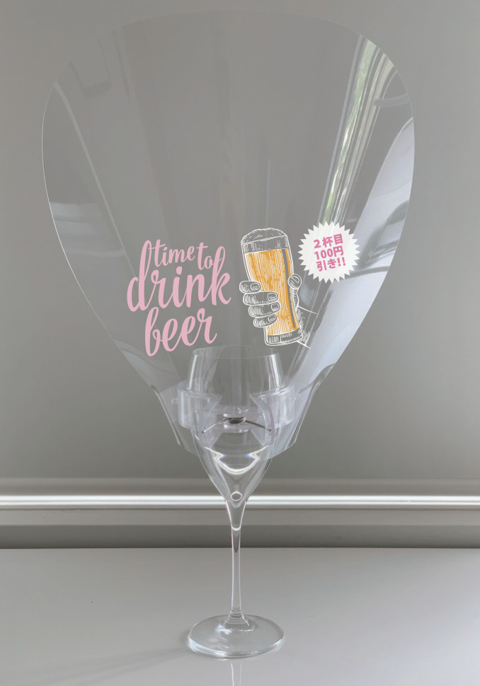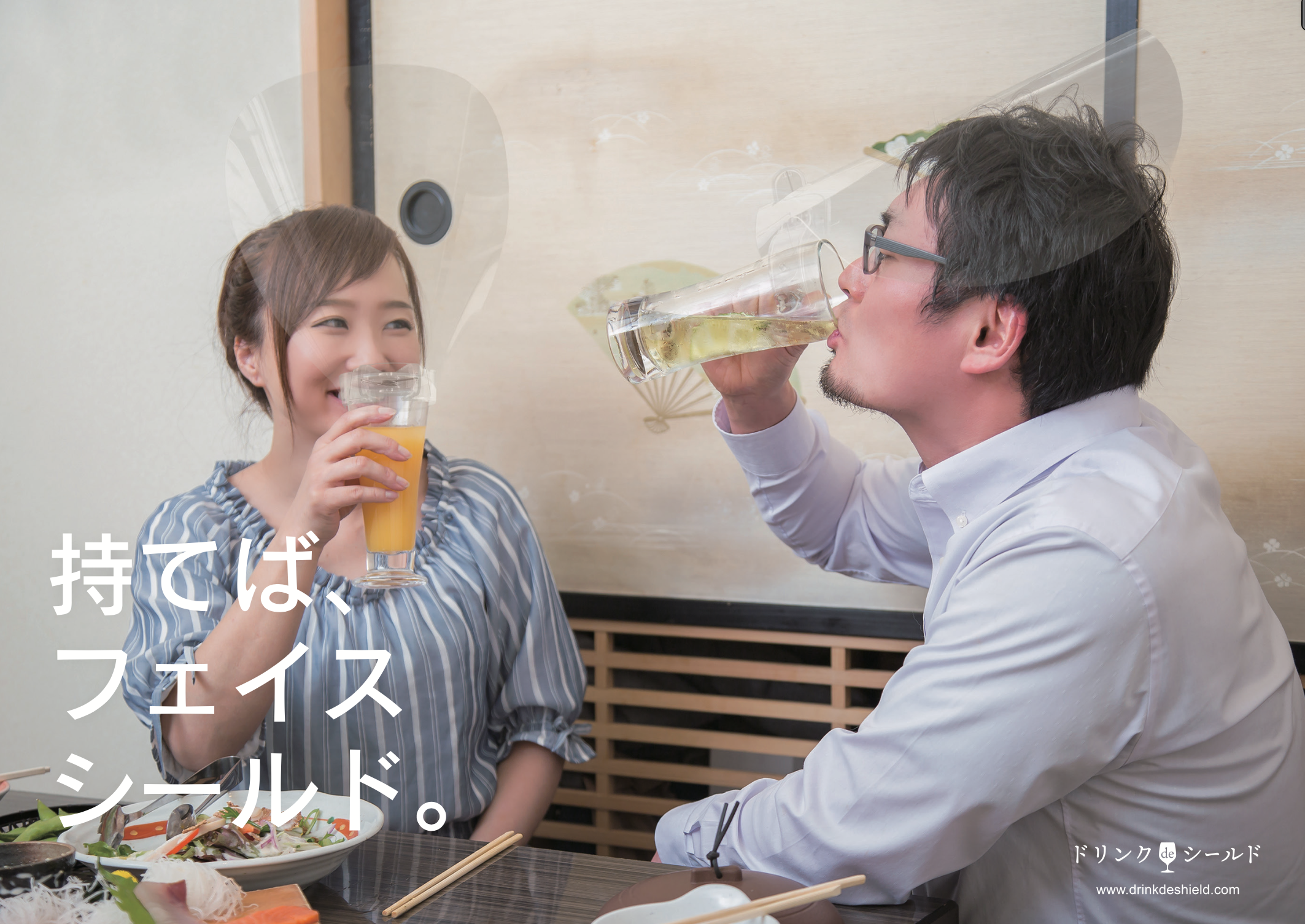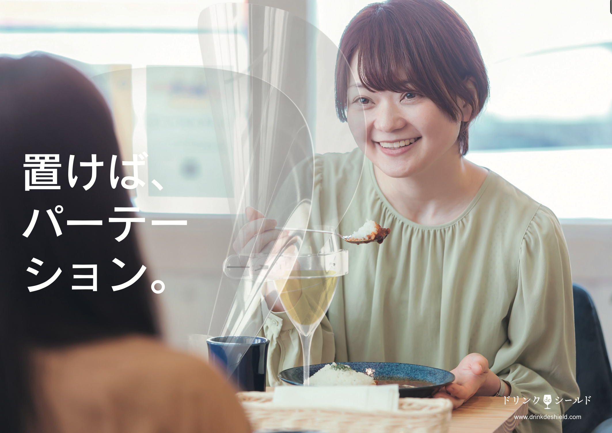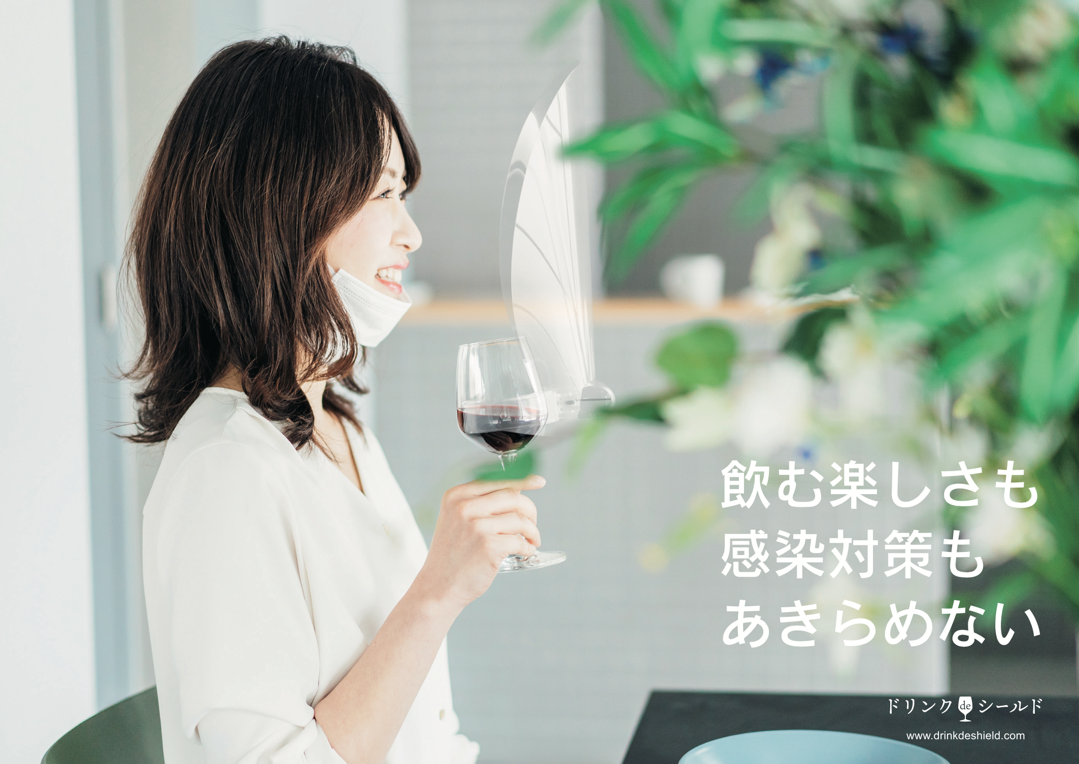 ドリンクdeシールドは、飲料用グラスに取り付ける飛沫防止シールドです。グラスを持っている時はフェイスシールドのように、テーブルに置いている時はパーテーションのように効果を発揮します。