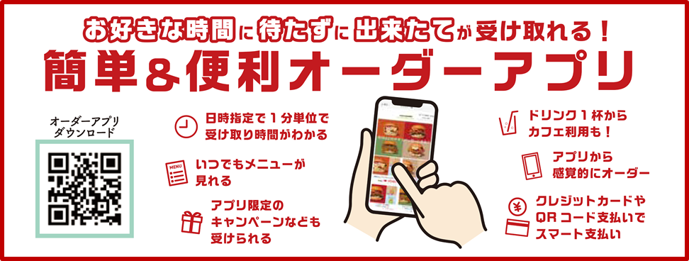 新作のチキンバーガー&バランスセットがオーダーアプリ(テイクアウト)で更にお得に楽しめます。単品でもセットでも100円引き!もちろんお得なだけでなく、お好きな時間にお店で待たずに出来たてが受け取れますので、お仕事の休憩中など限られた時間で、レジに並ぶことなく自分時間を有効に使えます。