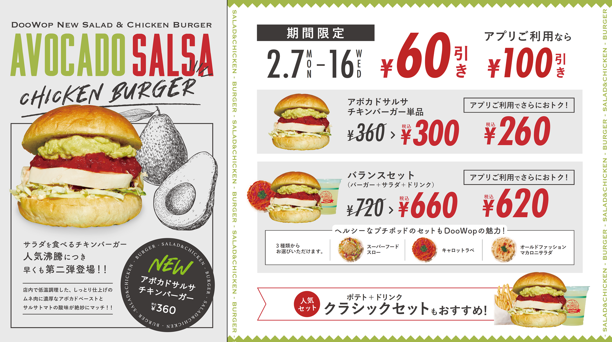 2月7日(月)~2月16日(水)「アボカドサルサ チキンバーガー」を300円(通常360円)、バランスセット660円(通常720円)で提供します。オーダーアプリ(テイクアウト)からのご注文なら更にお得に。是非この機会にお試しください。
