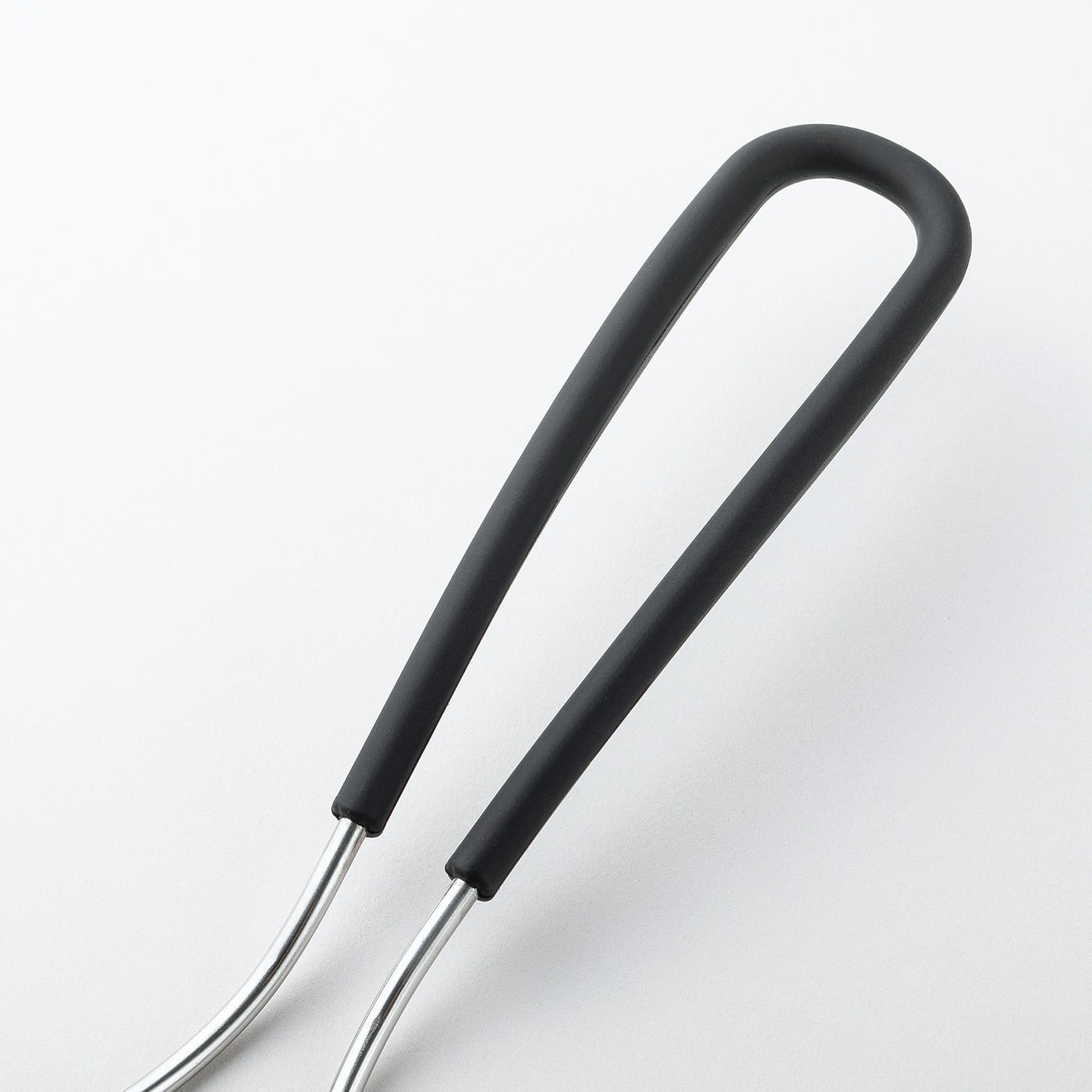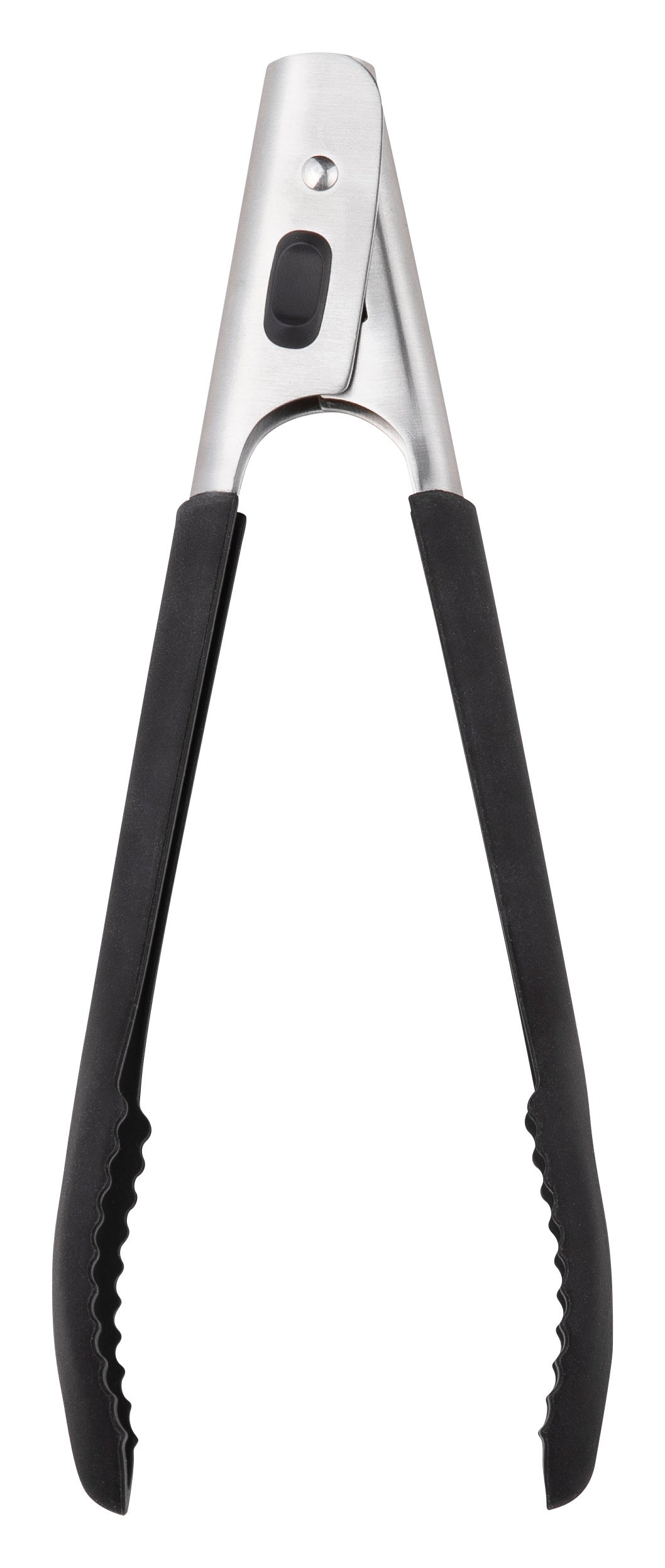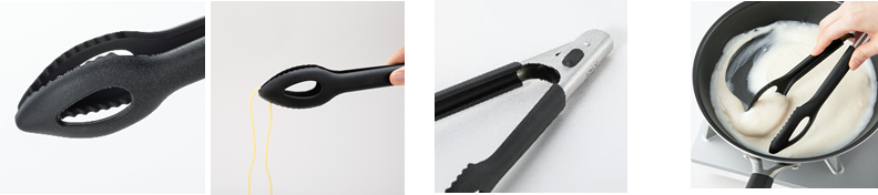 大きな食材からパスタ1本までつかみやすいシリコーントング。先端だけでなくハンドルまでシリコーンを巻いているので、使用中にハンドルが熱くなりにくく、ロック機能付きで、調理中の一時置きや収納の際に広がらず便利です。